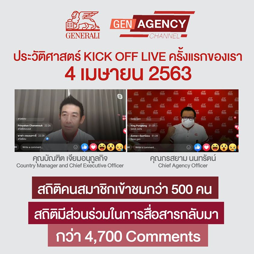 “สำหรับการสื่อสารระหว่างทีมบริหารกับตัวแทนทั่วประเทศนั้น เมื่อเร็วๆนี้ได้มีการจัดงาน Kick Off ประจำเดือน ในรูปแบบ Live หรือการถ่ายทอดสด ผ่านช่องทางออนไลน์ (Facebook Live- Gen Agency Channel) แทนการจัดอีเว้นท์ ซึ่งปกติเราจะจัดทุกๆเดือน ถือว่า ได้รับการตอบรับที่ดีจากตัวแทนที่เข้าร่วมเลยทีเดียว” นายกรสยาม กล่าว