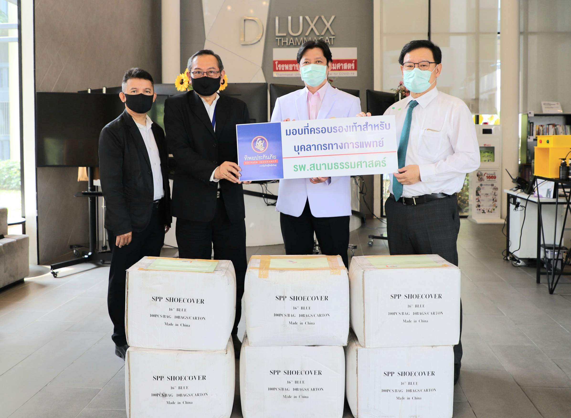 16 เมษายน 2563 : อาคม ไม้ดัดจันทร์ ผู้อำนวยการฝ่ายทรัพยากรบุคคล ทิพยประกันภัย มอบถุงคลุมรองเท้าป้องกันไวรัส ให้กับ ศ.ดร.สุรพล นิติไกรพจน์ ประธานกรรมการบริหารโรงพยาบาลธรรมศาสตร์เฉลิมพระเกียรติ ผศ.นพ.ฉัตรชัย มิ่งมาลัยลักษณ์ ผอ.รพ.สนามธรรมศาสตร์ เพื่อส่งต่อให้กับแพทย์พยาบาล และบุคลากรทางการแพทย์ นำไปใช้ในการปฏิบัติงานเป็นอุปกรณ์ป้องกันเพิ่มความปลอดภัย ในการดูแลผู้ป่วยที่ติดเชื้อโควิด – 19 ณ รพ.สนามธรรมศาสตร์ รังสิต ![]()