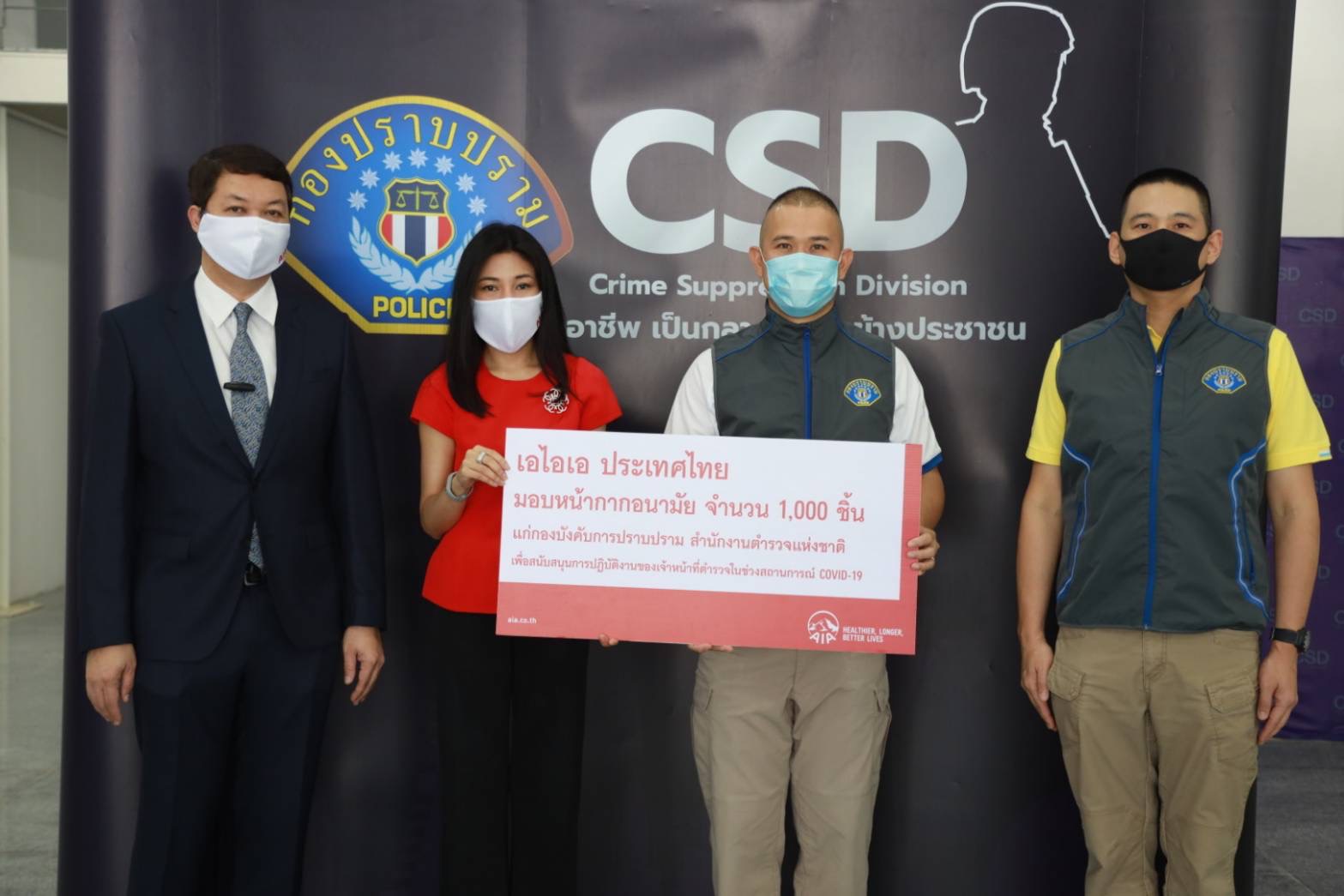 21 เมษายน 2563 : เอไอเอ ประเทศไทย นำโดย รพีพร วงศ์ทองคำ (ที่ 2 จากซ้าย) ผู้อำนวยการฝ่ายสื่อสารองค์กรและภาพลักษณ์ และ ปกป้อง ยินดีผล (ซ้าย) ผู้อำนวยการฝ่ายอสังหาริมทรัพย์ เป็นตัวแทนมอบหน้ากากอนามัยจำนวน 1,000 ชิ้น แก่ พ.ต.อ. จิรภพ ภูริเดช (ที่ 2 จากขวา) ผู้บังคับการกองบังคับการปราบปราม สำนักงานตำรวจแห่งชาติ เพื่อสนับสนุนการปฏิบัติงานของเจ้าหน้าที่ตำรวจในช่วงสถานการณ์การแพร่ระบาดของโรคโควิด-19 ให้ปลอดภัยจากการติดเชื้อ และเพื่อเป็นกำลังใจในการปฏิบัติงานของเจ้าหน้าที่ตำรวจ ซึ่งเสียสละปฏิบัติหน้าที่สำคัญในการให้ความช่วยเหลือประชาชนคนไทยในช่วงวิกฤตโควิด-19