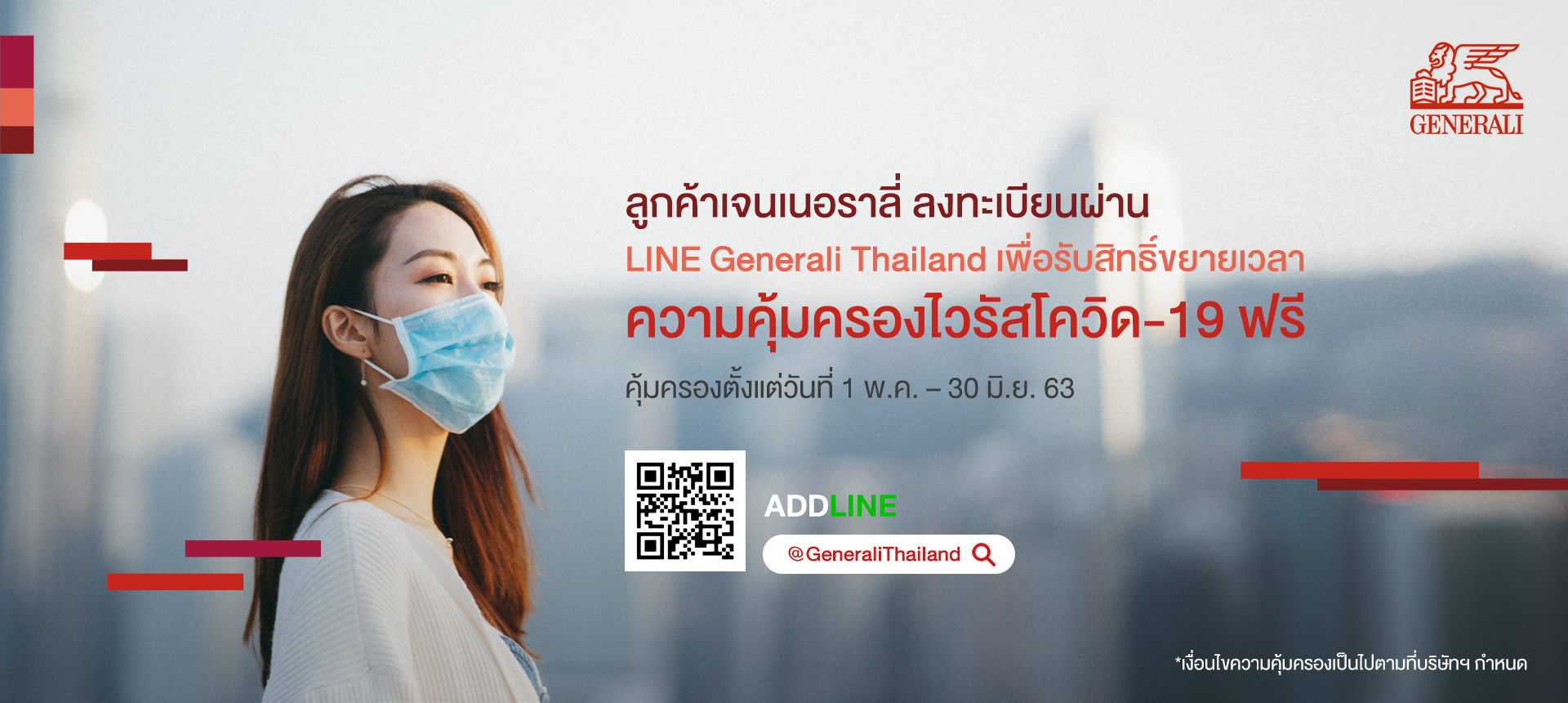 สำหรับลูกค้าเจนเนอราลี่ รับสิทธิ์ขยายเวลาความคุ้มครองไวรัสโควิด-19 เพิ่มเติมเพียงลงทะเบียนผ่านช่องทางไลน์ เจนเนอราลี่ ไทยแลนด์ (LINE Generali Thailand ) โดยจะได้รับความคุ้มครองค่ารักษาพยาบาลชดเชยรายวันเพิ่มเติม ในกรณีติดเชื้อไวรัสโคโรน่า 2019 (COVID-19) 1,000 บาท/ วัน สูงสุด 15 วัน พร้อมคุ้มครองกรณีการเจ็บป่วยภาวะโคม่า หรือกรณีเจ็บป่วยระยะสุดท้ายจากโรคติดเชื้อไวรัสโคโรนา 2019 (COVID-19) เพิ่มเติมเท่ากับวงเงินทุนประกันภัยตามกรมธรรม์ที่มีอยู่ไม่เกิน 100,000 บาท (จำกัด 1 สิทธิ์ ต่อ 1 ท่าน)*