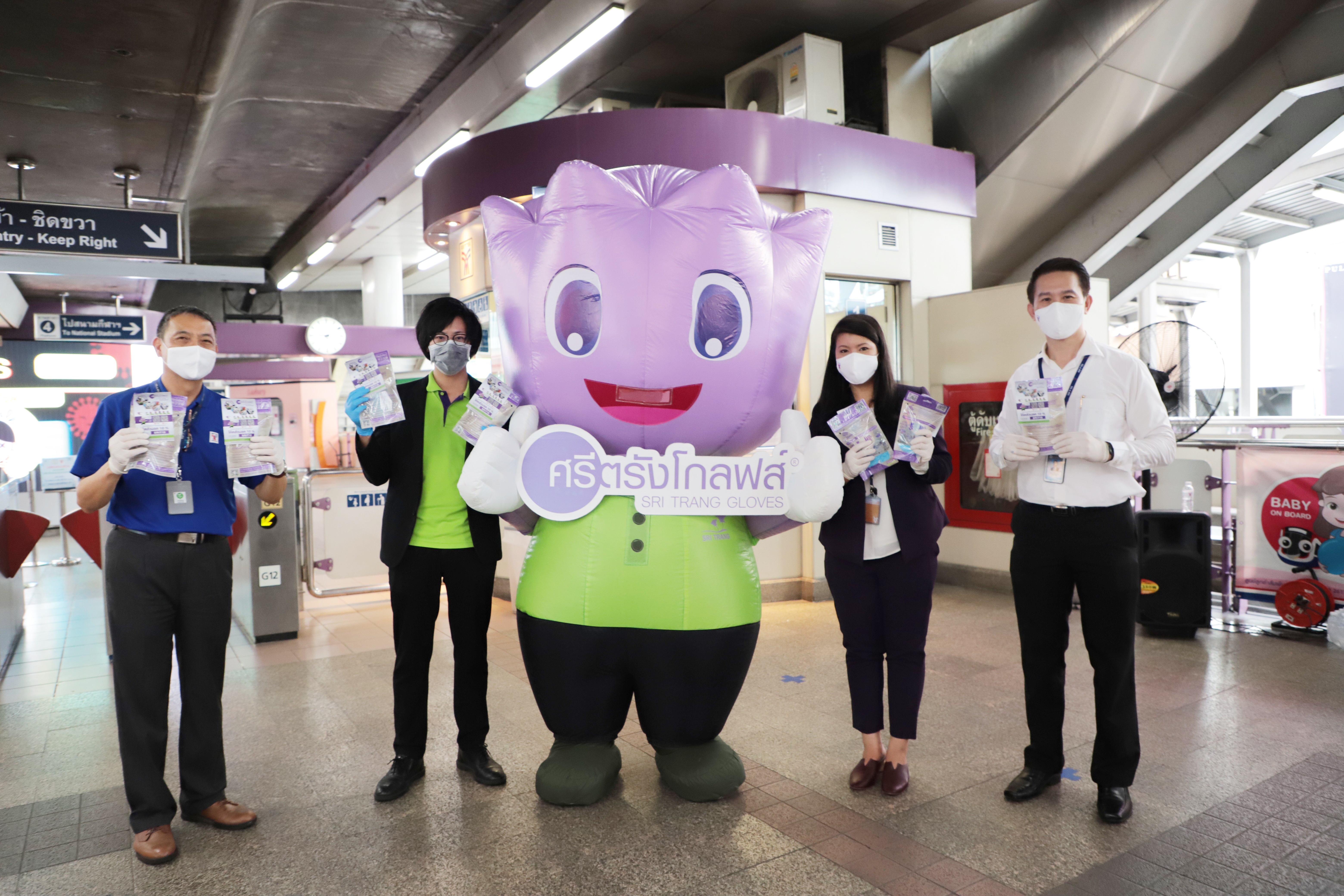 22 เมษายน 2563 : นายวิทย์นาถ สินเจริญกุล (ที่ 2 จากซ้าย) กรรมการบริษัท ศรีตรังโกลฟส์ (ประเทศไทย) จำกัด (มหาชน) หรือ STGT ร่วมกับ นายสุมิตร ศรีสันติธรรม (ขวาสุด) ผู้อำนวยการใหญ่สายปฏิบัติการ บริษัท ระบบขนส่งมวลชนกรุงเทพ จำกัด (มหาชน) และคณะผู้บริหารของบริษัทฯ จัดกิจกรรมเพื่อสังคม นำถุงมือยางของศรีตรังโกลฟส์จำนวน 10,000 ชิ้น แจกให้ผู้โดยสารรถไฟฟ้าบีทีเอส และเจ้าหน้าที่สถานี BTS ณ สถานีศาลาแดง เพื่อร่วมยับยั้งการแพร่ระบาดของโรค COVID-19 และแสดงความห่วงใยแก่ประชาชนภายใต้แนวคิด พร้อมส่งมอบ ‘การปกป้องทุกสัมผัส ด้วยความห่วงใย’ (Touch of Life) ไปสู่ทุกชีวิตทั่วโลก ![]()