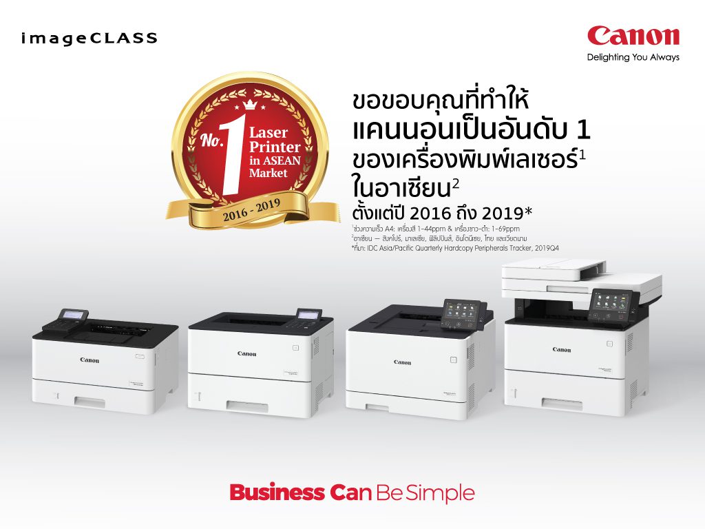23 เมษายน 3563 : แคนนอน ผู้นำตลาดเครื่องพิมพ์อิงค์เจ็ทอันดับ 1 ในประเทศไทยต่อเนื่อง 19 ปีซ้อน ได้รับการจัดอันดับให้เป็นแบรนด์เลเซอร์พรินเตอร์อันดับ 1 ของอาเซียน (สิงคโปร์ มาเลเซีย ฟิลิปปินส์ อินโดนีเซีย ไทย และเวียดนาม) ต่อเนื่อง 4 ปีซ้อน ตั้งแต่ปี 2016-2019 ในกลุ่มเครื่องพิมพ์เลเซอร์ช่วงความเร็ว A4 เครื่องสี 1-44 ppm เครื่องขาว-ดำ 1-69 ppm โดย IDC บริษัทวิจัยตลาดไอซีทีชั้นนำของโลก ในรายงาน IDC Asia/Pacific Quarterly Hardcopy Peripherals Tracker, 2019Q4