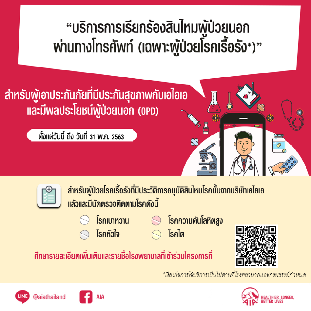 *สำหรับเงื่อนไขผู้เอาประกันภัยที่มีสิทธิรับบริการการเรียกร้องสินไหมผู้ป่วยนอกผ่านทางโทรศัพท์ ในช่วงสถานการณ์การแพร่ระบาดของโรคโควิด-19 ต้องเป็นผู้เอาประกันภัยที่มีประกันสุขภาพกับเอไอเอ และมีผลประโยชน์ผู้ป่วยนอก (OPD) ซึ่งต้องเป็นผู้ป่วยโรคเรื้อรังที่มีประวัติการอนุมัติสินไหมโรคนั้นจากเอไอเอแล้ว และมีการนัดตรวจติดตามโรคดังนี้ โรคเบาหวาน โรคความดันโลหิตสูง โรคหัวใจ และโรคไต โดยค่าใช้จ่ายที่เอไอเอให้ความคุ้มครองได้แก่ ค่ายา ค่าเวชภัณฑ์ 1 ค่าธรรมเนียมแพทย์ และค่าตรวจทางห้องปฏิบัติการที่เกี่ยวข้องกับโรค ได้แก่ การตรวจวัดระดับน้ำตาลในเลือด การทำงานของไต หรือหัวใจ