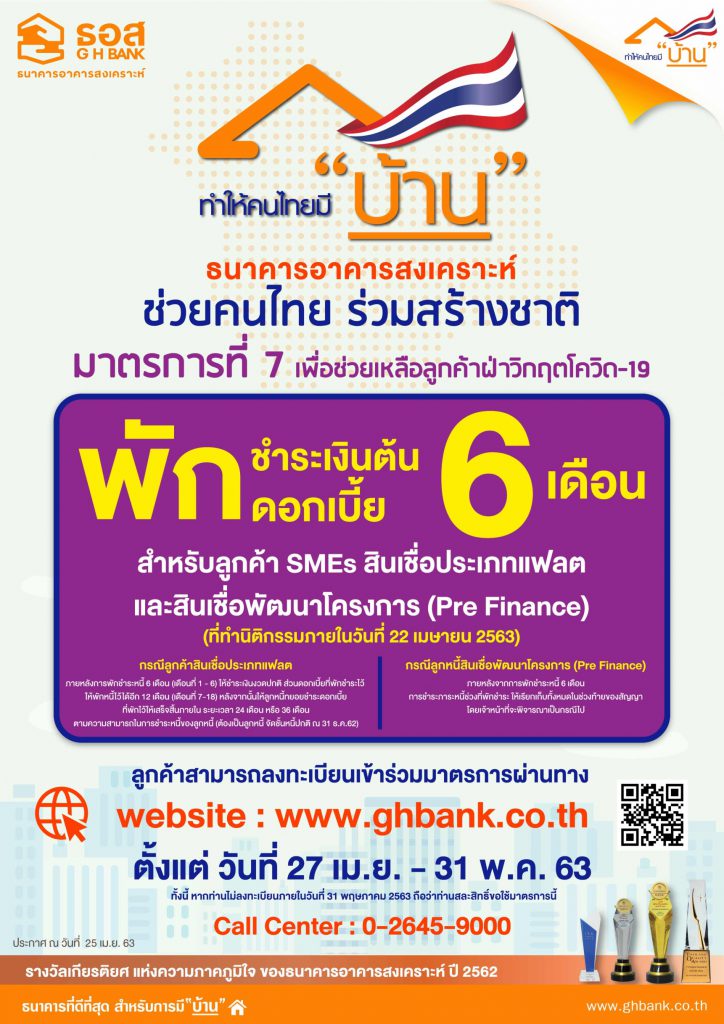 เพื่อให้ผู้ประกอบการ SMEs มีเงินทุนและสภาพคล่องเพียงพอในการดำเนินธุรกิจและรักษาการจ้างงาน ส่วนดอกเบี้ยที่พักชำระไว้ ธนาคารได้แบ่งเบาภาระค่าใช้จ่ายในการชำระให้แก่ลูกค้า แบ่งเป็น กรณีสินเชื่อแฟลต ให้พักชำระดอกเบี้ยได้อีก 12 เดือน จากนั้นให้ทยอยชำระดอกเบี้ยที่พักชำระไว้ภายใน 24 เดือน หรือ 36 เดือน ตามความสามารถในการชำระหนี้ของลูกหนี้ ส่วนกรณีสินเชื่อพัฒนาโครงการ (Pre Finance) ให้ชำระในช่วงท้ายของสัญญากู้เงิน ลงทะเบียนแจ้งความประสงค์เข้ามาตรการผ่านทาง www.ghbank.co.th ตั้งแต่วันที่ 27 เมษายน – 31 พฤษภาคม 2563