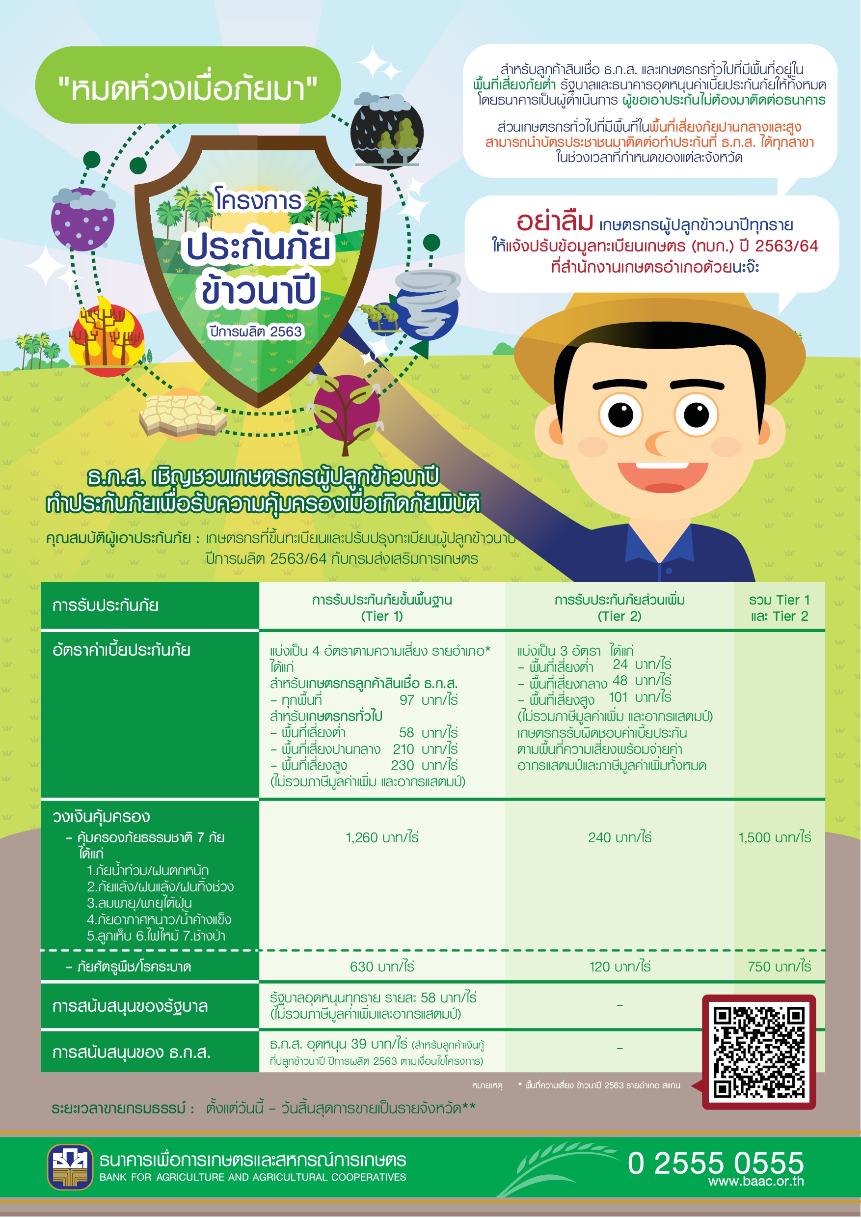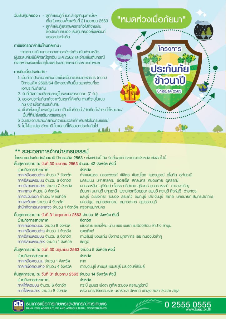 29 เมษายน 2563 : ธ.ก.ส. เดินหน้าโครงการประกันภัยข้าวนาปี ปีการผลิต 2563 พื้นที่เป้าหมาย 45.7 ล้านไร่ เพื่อให้เกษตรกรได้รับความคุ้มครอง กรณีเกิดภัยพิบัติทางธรรมชาติและภัยจากศัตรูพืช โดยรัฐบาลสนับสนุนค่าเบี้ยประกันภัย เพื่อจูงใจให้เกษตรกรเห็นประโยชน์ของการทำประกันภัย และกรณีเป็นเกษตรกรลูกค้า ธ.ก.ส. สมทบ ค่าเบี้ยประกันภัย พร้อมหนุนเกษตรกรทำประกันภัยส่วนเพิ่ม เพื่อเพิ่มความคุ้มครองและลดความเสี่ยงในการผลิต โดยเปิดรับทำประกันภัยแล้วตั้งแต่บัดนี้ที่ ธ.ก.ส. ทุกสาขา