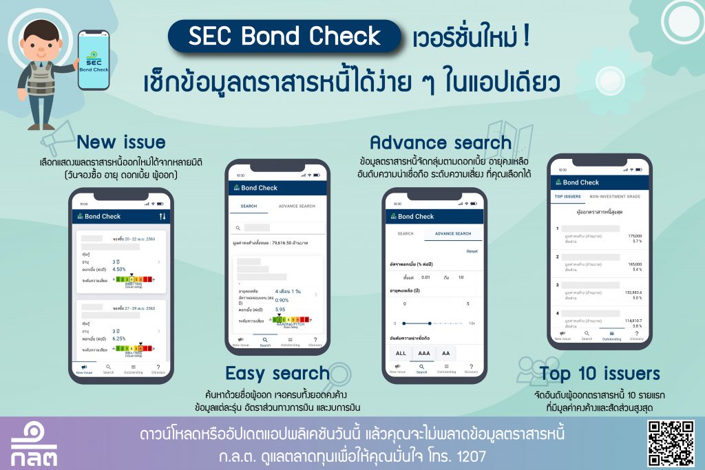 เมื่อวันที่ 30 เมษายน 2563 ก.ล.ต. ได้เปิดให้ใช้บริการ SEC Bond Check เวอร์ชัน 2 ซึ่งพัฒนาต่อยอดจากเวอร์ชันแรก เพื่อตอบโจทย์ผู้ลงทุนและผู้สนใจที่ต้องการค้นหาข้อมูลที่หลากหลายมากขึ้น โดยผู้ใช้จะสามารถค้นหา