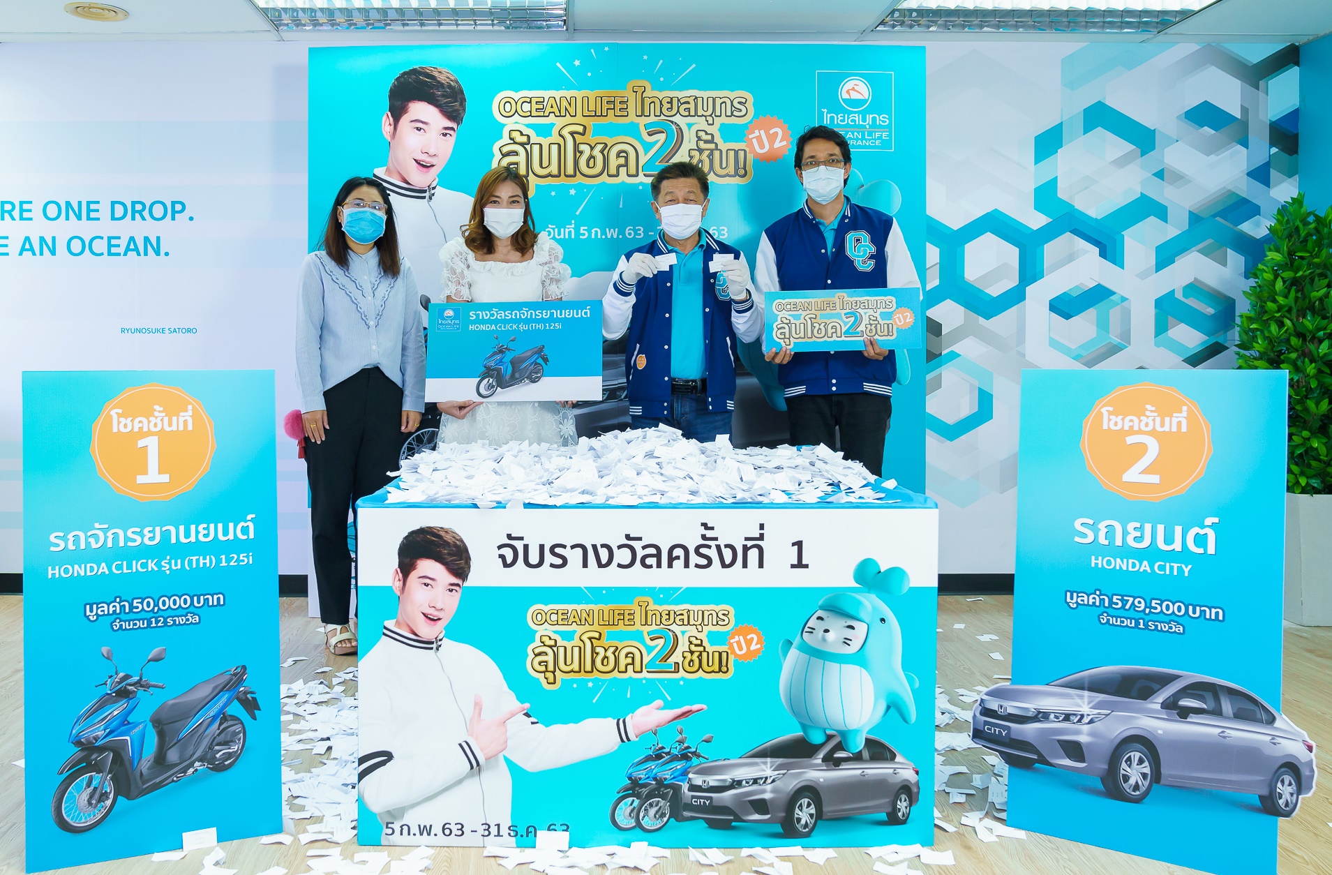 30 เมษายน 2563 : บมจ.ไทยสมุทรประกันชีวิต รักคือพลังของชีวิต โดย สมชัย อาภรณ์ศิริพงษ์ (ที่ 2 จากขวา) รองกรรมการผู้จัดการ เป็นประธานในพิธีจับรางวัลครั้งที่ 1 แคมเปญ “OCEAN LIFE ไทยสมุทร ลุ้นโชค 2 ชั้น ปี 2” โดยได้จัดการจับรางวัลเป็นแบบระบบปิดเพื่อความปลอดภัยจาก COVID-19 สำหรับลูกค้าผู้โชคดีจากการจับรางวัลครั้งแรกจะได้รับรถจักรยานยนต์ Honda Click 125i มูลค่า 50,000 บาท จำนวน 4 รางวัล ได้แก่ คุณนิพนธ์ พระสิงห์ คุณสันติวัน ปิ่นจันทร์ คุณสุรพล แก่นจันทร์ และคุณจัด บุญหลาย ผู้โชคดีทุกท่านต้องติดต่อยืนยันสิทธิ์ ภายใน 30 พฤษภาคม 2563