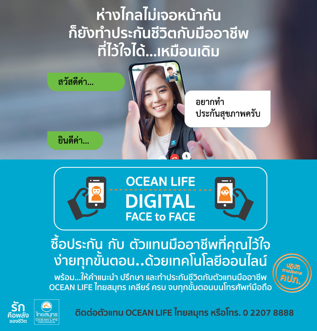 ในขณะที่การดำรงชีวิตของผู้คนในสังคมมีการเปลี่ยนแปลงไป ไม่ว่าจะเป็นการอยู่บ้านเพื่อหยุดการแพร่เชื้อ การทำงานจากที่บ้าน (Work from Home) และการเว้นระยะห่างทางสังคม (Social Distancing) ซึ่งสิ่งเหล่านี้ผลักดันให้ OCEAN LIFE ไทยสมุทร เพิ่มการขายรูปแบบใหม่! OCEAN LIFE DIGITAL FACE to FACE ให้ลูกค้าประชาชนเข้าถึงการประกันชีวิตด้วยความปลอดภัยจากการติดเชื้อ พร้อมรับการบริการจากตัวแทนประกันชีวิตมืออาชีพโดยไม่ต้องเข้าพบให้เกิดความเสี่ยง