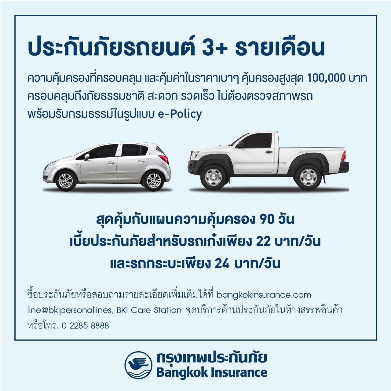 จากสถานการณ์การแพร่ระบาดของโรคติดเชื้อไวรัสโคโรนา (COVID-19) ส่งผลให้มีการปรับรูปแบบการใช้ชีวิต รวมถึงความจำเป็นในการใช้รถยนต์อาจน้อยลง บริษัท กรุงเทพประกันภัย จำกัด (มหาชน) จึงได้ออกแผนประกันภัยรถยนต์ 3+ รายเดือน ที่ให้ความคุ้มครองที่ครอบคลุม และคุ้มค่าด้วยราคาเบาๆ ด้วยบริการคุณภาพจากกรุงเทพประกันภัย เพื่อตอบสนองไลฟ์สไตล์ของลูกค้าที่มีการใช้รถยนต์น้อยลง