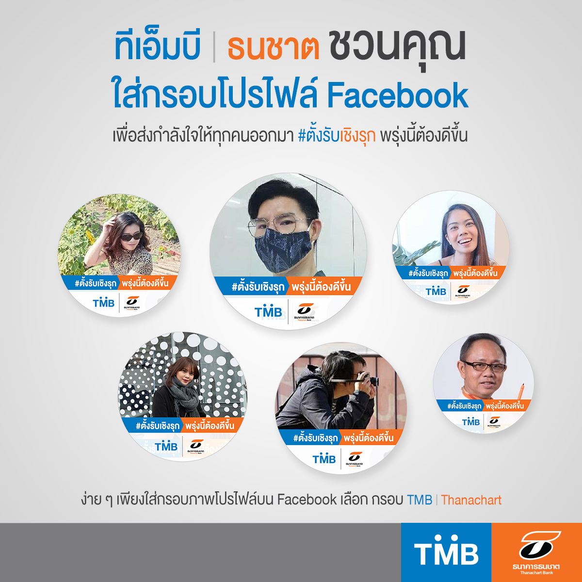 · ไปที่ โปรไฟล์ของเรา > แตะที่ภาพโปรไฟล์ > แตะ “เพิ่มกรอบ” หรือ “Add Frame”> เลือกกรอบรูป TMB | Thanachart ตั้งรับเชิงรุก พรุ่งนี้ต้องดีขึ้น