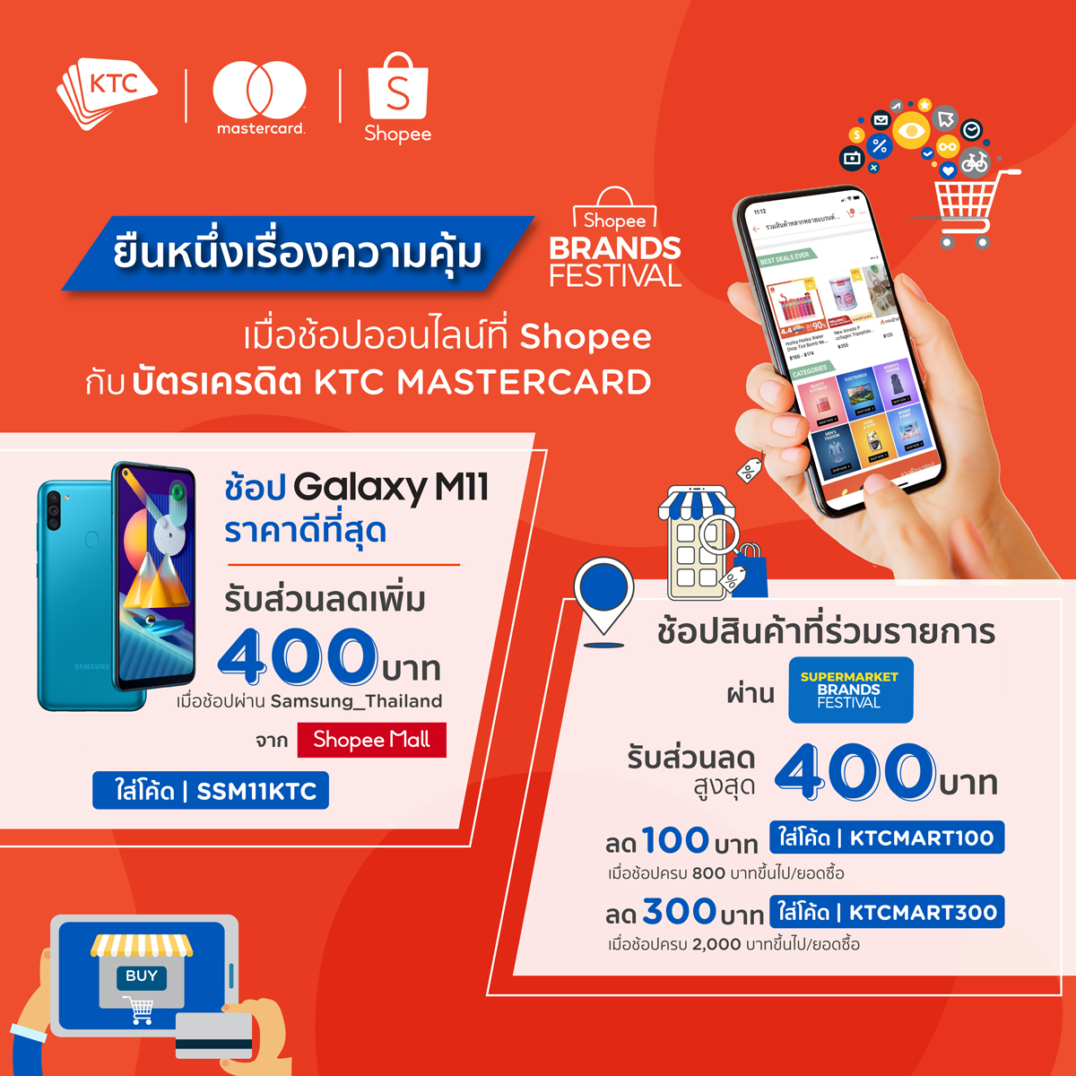8 พฤษภาคม 2563 : นายณัฐสิทธิ์ สุนทราณู ผู้อำนวยการ – ธุรกิจบัตรเครดิต “เคทีซี” หรือ บริษัท บัตรกรุงไทย จำกัด (มหาชน) จับมือ “มาสเตอร์การ์ด” และ “ช้อปปี้” (Shopee) ร่วมเฉลิมฉลองแคมเปญ“Shopee Brands Festival” สุดยิ่งใหญ่ในเดือนพฤษภาคมนี้ จัดแพ็ค 2 สิทธิพิเศษมอบให้กับสมาชิกบัตรเครดิตเคทีซี-มาสเตอร์การ์ดทุกประเภท เมื่อช้อปสินค้าออนไลน์ผ่านแอปฯ ช้อปปี้ ดังนี้
