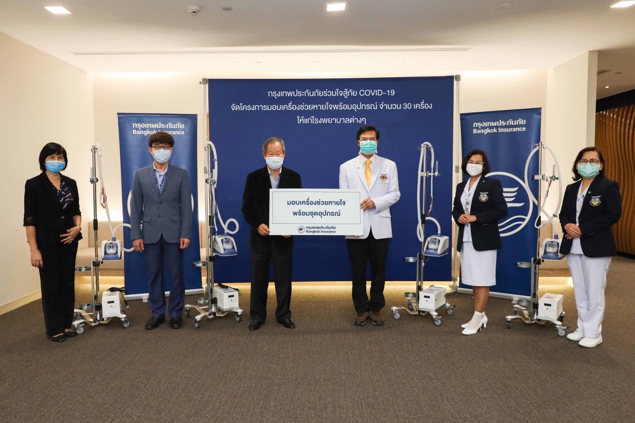 11 พฤษภาคม 2563 : บริษัท กรุงเทพประกันภัย จำกัด (มหาชน) หรือ BKI นำโดย ชัย โสภณพนิช (ที่ 3 จากซ้าย) ประธานกรรมการ พร้อมด้วย ดร.อภิสิทธิ์ อนันตนาถรัตน (ที่ 2 จากซ้าย) กรรมการและประธานคณะผู้บริหาร ได้มอบเครื่องช่วยหายใจ พร้อมชุดอุปกรณ์ จำนวน 4 เครื่อง ให้แก่โรงพยาบาลนพรัตนราชธานี โดยมี นายแพทย์ปิยชาติ สุทธินาค (ที่ 3 จากขวา) แพทย์กลุ่มงานออร์โธปิดิกส์ (OPD) เป็นผู้แทนรับมอบ เพื่อใช้ในการรักษาผู้ป่วยรองรับสถานการณ์การแพร่ระบาดของโรคติดเชื้อไวรัสโคโรนา (COVID-19) ณ อาคารกรุงเทพประกันภัย ถนนสาทรใต้ เมื่อวันที่ 7 พฤษภาคม 2563