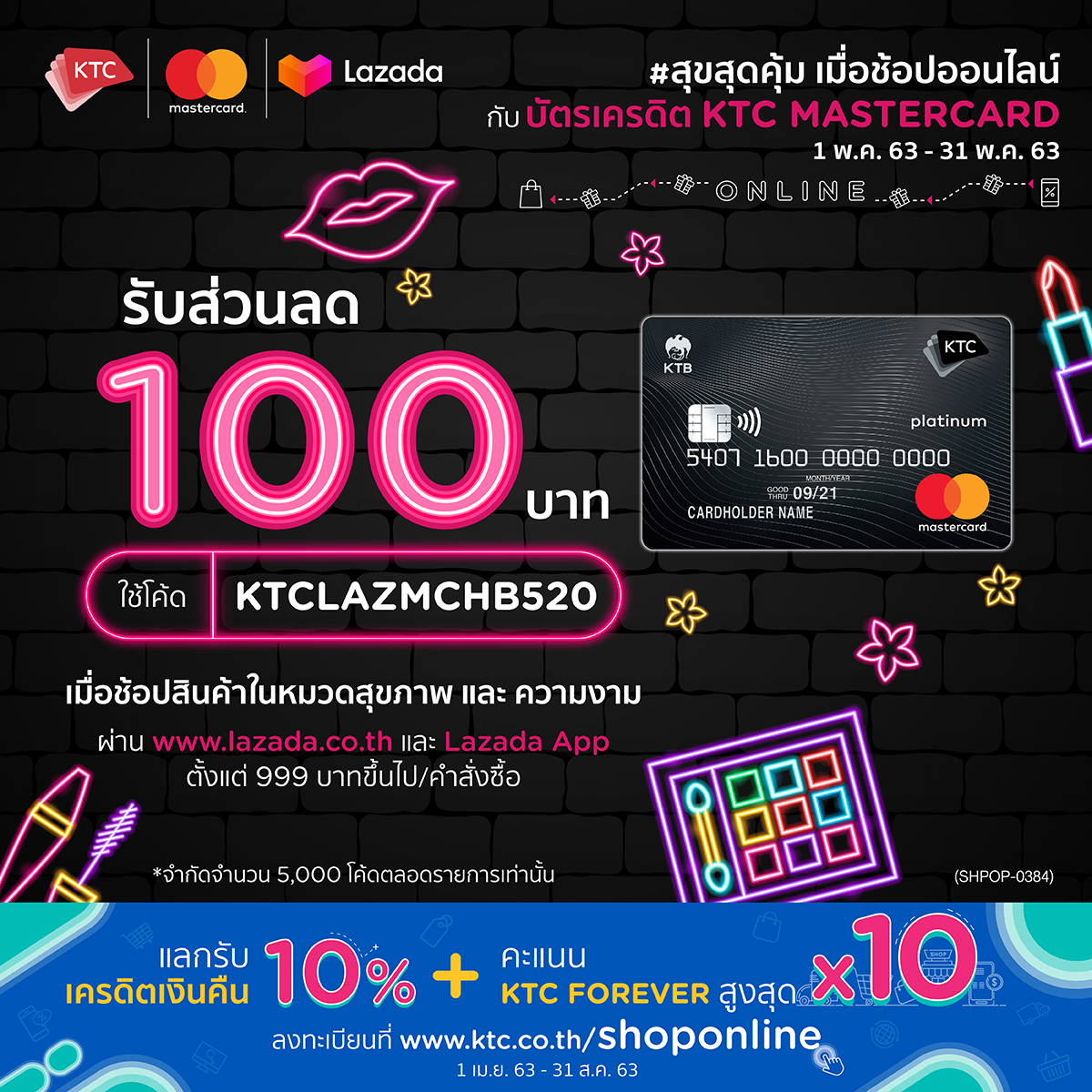 พร้อมรับสิทธิพิเศษเพิ่มในรูปแบบของเครดิตเงินคืน 10%เมื่อใช้คะแนน KTC FOREVER เท่ายอดซื้อต่อรายการ และรับคะแนน KTC FOREVER สูงสุด 10 เท่า (คะแนนปกติ 1 เท่า และคะแนนพิเศษ 9 เท่า) ตั้งแต่วันที่ 1 เมษายน 2563 – 31 สิงหาคม 2563 โดยลงทะเบียนแลกรับสิทธิพิเศษ หรือ ดูรายละเอียดเพิ่มเติมได้ที่ www.ktc.co.th/shoponlineแหล่งรวมโค้ดส่วนลดจากพันธมิตรออนไลน์ที่มากที่สุด หรือ Lazada Call Center โทร.0-2018-0000 ทุกวันจันทร์-วันเสาร์ ตั้งแต่เวลา 9.00-18.00 น.