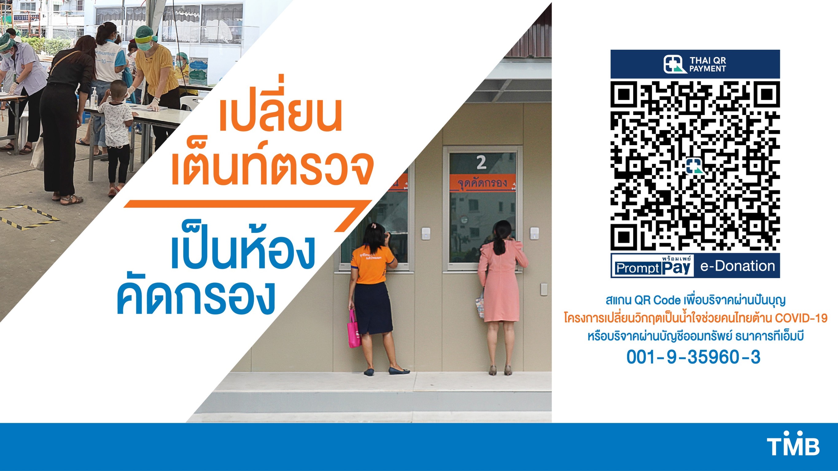 กรุงเทพฯ 13 พฤษภาคม 2563 : มูลนิธิทีเอ็มบี ขอเชิญชวนพี่น้องชาวไทยร่วมบริจาคสมทบทุน เพื่อร่วมสนับสนุนการทำงาน และป้องกันความเสี่ยงสำหรับบุคลากรแพทย์ เปลี่ยนเต็นท์คัดกรองชั่วคราวให้เป็นห้องคัดกรองผู้ป่วยที่ได้มาตรฐานแก่โรงพยาบาลพระนั่งเกล้า ศูนย์กลางในการรักษาโรค COVID-19 จังหวัดนนทบุรี ซึ่งเป็นหนึ่งในจังหวัดที่มีผู้ติดเชื้อสูงสุดอันดับต้น ๆ ของประเทศ ในโครงการ “เปลี่ยนวิกฤตเป็นน้ำใจช่วยคนไทยต้าน COVID-19”
