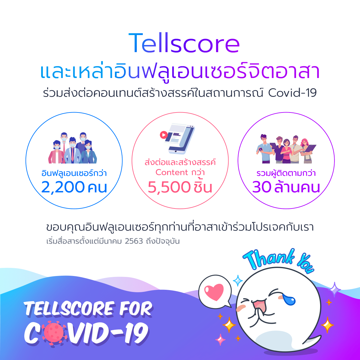 Tellscore ในฐานะตัวแทนด้านสื่ออินฟลูเอนเซอร์อันดับหนึ่งของเมืองไทย จึงขอเป็นส่วนหนึ่งของการเชื่อมต่อแหล่งข่าวที่มีความน่าเชื่อถือ ให้เข้าถึงคนได้มากที่สุด ด้วยการรวมพลังอินฟลูเอนเซอร์จิตอาสากว่า 2,200 คน ในการประชาสัมพันธ์เผยแพร่ข้อมูลข่าวสารดังกล่าวเกี่ยวกับสถานการณ์ไวรัสโควิด-19 สำหรับโครงการที่ Tellscore ประสานงานให้เหล่าอินฟลูเอนเซอร์จิตอาสา มีมากกว่า 20 โครงการ อาทิ