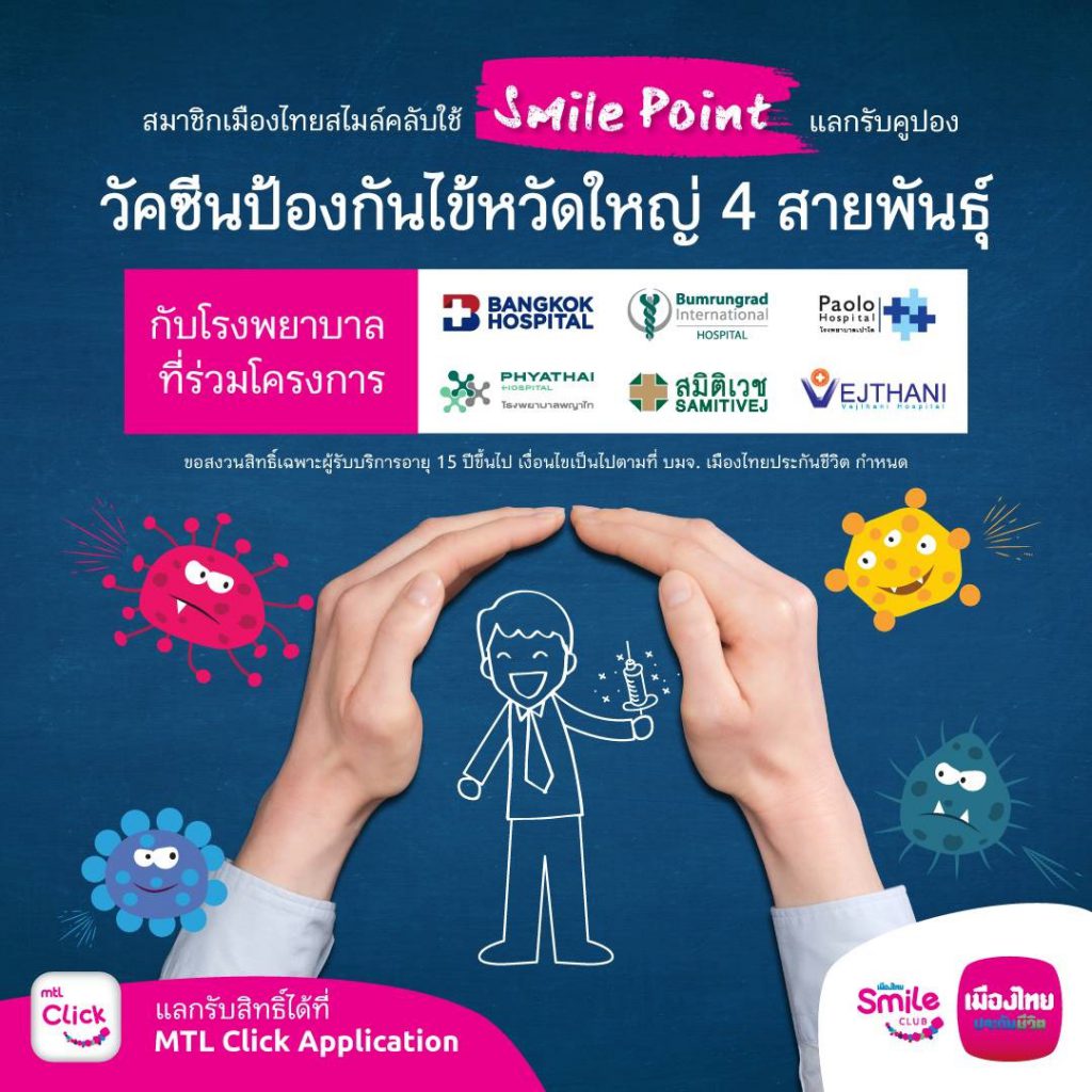 พร้อมเชิญชวนสมาชิกฯ ใช้คะแนนสะสม Smile Points แลกรับ คูปองวัคซีนป้องกันไข้หวัดใหญ่ 4 สายพันธุ์ จากโรงพยาบาลชั้นนำที่เข้าร่วมโครงการ เพื่อมอบสุขภาพดีเป็นของขวัญให้ตัวเองหรือคนที่คุณรัก โดยสามารถแลกคะแนนได้ผ่านช่องทาง MTL Click Application หรือ โทร. 1766 กด 4 กด 2 ทุกวันจันทร์ – ศุกร์ ตั้งแต่เวลา 08.30 – 17.00 น. (ยกเว้นวันหยุดนักขัตฤกษ์)