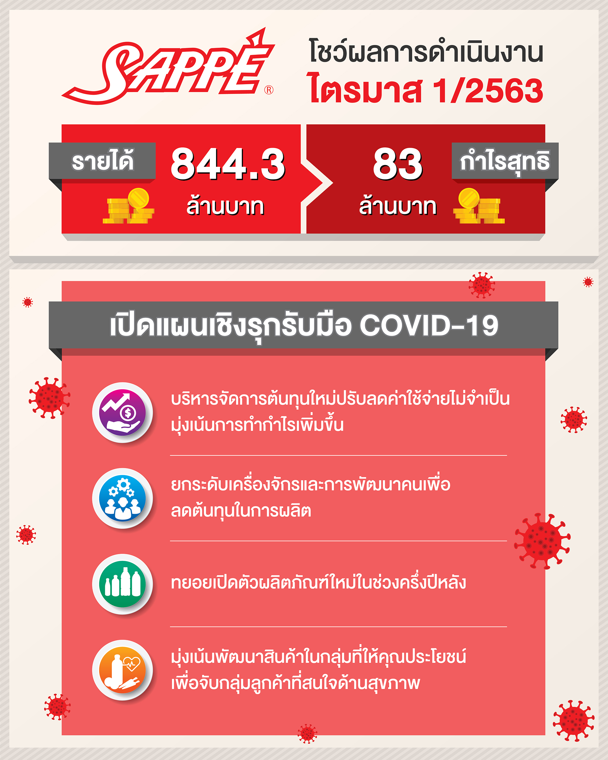 ประธานเจ้าหน้าที่บริหาร SAPPE กล่าวว่า ถึงแม้ว่าผลการดำเนินงานในไตรมาส 1 เป็นไปตามเป้าหมายที่วางไว้ แต่จากการประเมินผลกระทบจากสถานการณ์การแพร่ระบาดของเชื้อไวรัสโคโรนาสายพันธุ์ใหม่ (COVID-19) ถึงแม้ว่าสินค้าอุปโภค-บริโภคเป็นอุตสาหกรรมที่ได้รับผลกระทบต่ำเมื่อเทียบกับธุรกิจอื่นๆ แต่คาดว่าความต้องการซื้อสินค้าอุปโภคบริโภคในช่วงไตรมาส 2/2563 มีแนวโน้มชะลอตัว