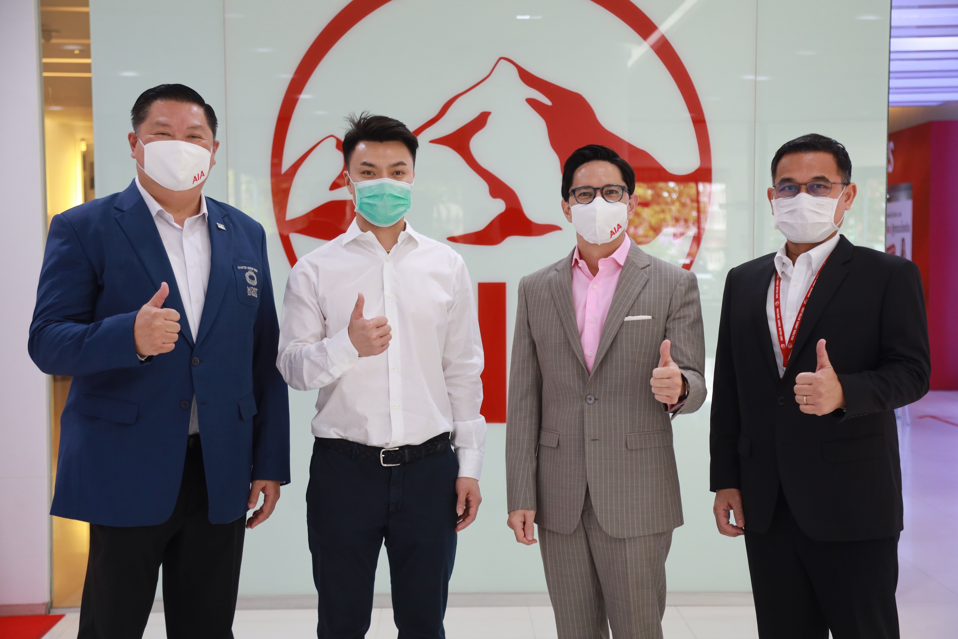 22 พฤษภาคม 2563 : นายกฤษณ์ จันทโนทก (ที่สองจากขวา) ประธานเจ้าหน้าที่ฝ่ายตัวแทนประกันชีวิต เอไอเอ ประเทศไทย เป็นตัวแทนมอบของที่ระลึกเพื่อเป็นการขอบคุณให้แก่ นายฉลองชัย มาเสถียรวงศ์ (ที่สองจากซ้าย) ซึ่งเป็นลูกค้ารายแรกของเอไอเอ ประเทศไทย ที่ซื้อกรมธรรม์ประกันชีวิต ‘เอไอเอ ซีไอ ซุปเปอร์แคร์ (AIA CI SuperCare)’ ผลิตภัณฑ์ประกันโรคร้ายแรง ผ่านการนำเสนอขายรูปแบบใหม่ ‘Digital Face to Face’ ถือเป็นความสำเร็จของเอไอเอ ประเทศไทย รวมไปถึงตัวแทนประกันชีวิตเอไอเอ ที่ได้ดูแลและมอบความคุ้มครองให้แก่ลูกค้า แม้อยู่ในช่วงสถานการณ์การแพร่ระบาดของโรคโควิด-19 ที่ต้องมีการเว้นระยะห่างทางสังคม (Social Distancing)