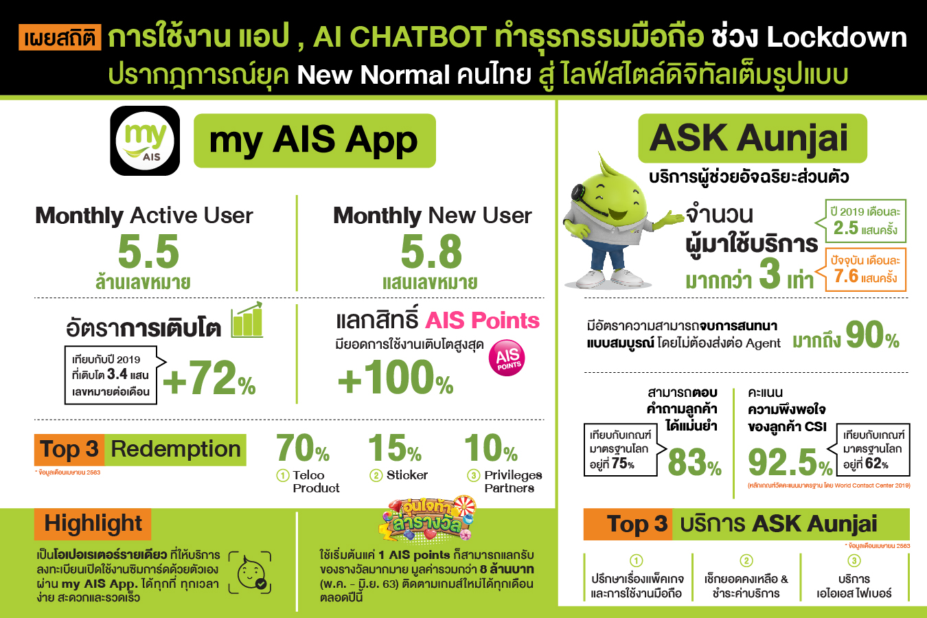 จากมาตรการปิดสถานที่ต่างๆ รวมถึง ห้างสรรพสินค้า เมื่อวันที่ 22 มีนาคม 2563 มีผลให้ลูกค้า เอไอเอส เข้ามาใช้งานบนแอปพลิเคชัน myAIS เพิ่มสูงขึ้นอย่างมาก และ ASK Aunjai : AI อัจฉริยะ เติบโตมากกว่าเท่าตัว และยังคงเป็นช่องทางหลักที่ลูกค้าใช้งานเป็นประจำมาจนถึงปัจจุบัน ด้วยขีดความสามารถในการรองรับด้านเทคโนโลยีดิจิทัลที่เอไอเอสเตรียมความพร้อมมาอย่างต่อเนื่อง และพร้อมเดินหน้าสร้าง Digital Engagement ผ่าน Gamification ตอบโจทย์ Lifestyle แบบ New Normal ยุคโควิด