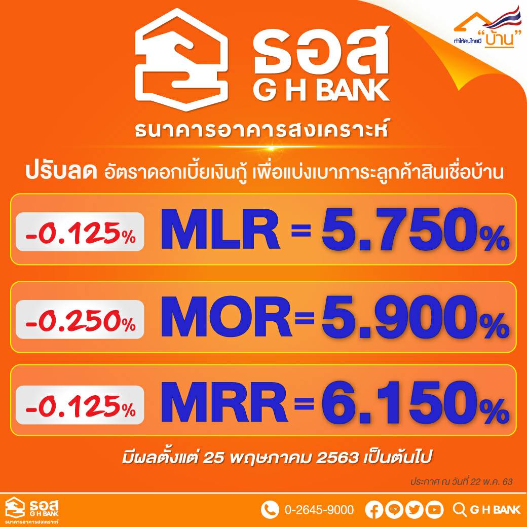 การปรับลดดอกเบี้ยเงินกู้ในครั้งนี้นับเป็นการบรรเทาภาระค่าใช้จ่ายด้านดอกเบี้ย ให้แก่ลูกค้าปัจจุบันของธนาคาร ซึ่งการผ่อนชำระเงินงวดรายเดือนจำนวนเท่าเดิม จะทำให้จำนวนเงินต้นคงเหลือของลูกค้าลดลง เร็วยิ่งขึ้น ขณะเดียวกันยังเพิ่มโอกาสให้ประชาชนได้มีบ้านตามที่ต้องการ เพราะอัตราดอกเบี้ยที่ลดลง จะทำให้ผู้กู้ใหม่มีโอกาสได้รับวงเงินกู้ที่สูงขึ้นด้วยรายได้สุทธิจำนวนเท่าเดิม สอบถามรายละเอียด หรือติดตามข้อมูลข่าวสารของธนาคารเพิ่มเติมได้ที่ www.ghbank.co.th หรือ Facebook Fanpage ธนาคารอาคารสงเคราะห์ และศูนย์ลูกค้าสัมพันธ์ (Call Center) โทร 0-2645-9000 ![]()