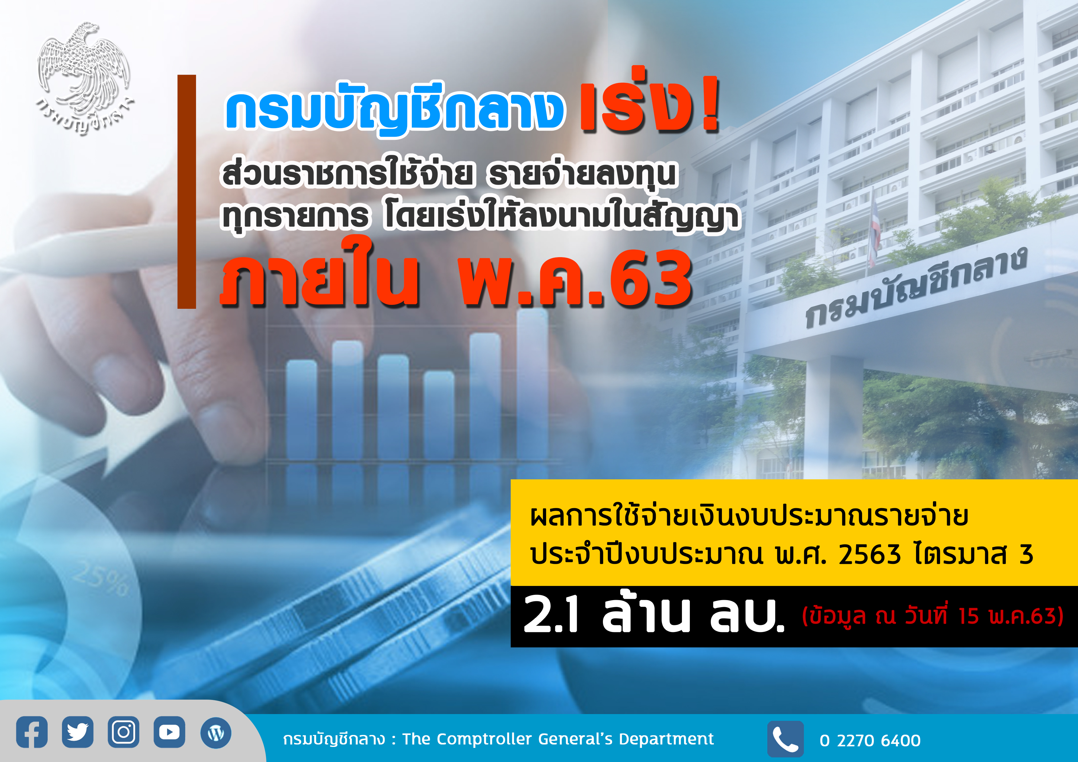 (2) รายจ่ายลงทุน อาทิ รายการปีเดียวที่ยังไม่ประกาศดำเนินการจัดซื้อจัดจ้างภายในวันที่ 7 เมษายน 2563 และ/หรือไม่สามารถลงนามได้ภายในวันที่ 31 พฤษภาคม 2563 รายการที่สามารถชะลอการดำเนินการโดยไม่ก่อให้เกิดความเสียหายต่อทางราชการ หรือไม่สามารถดำเนินการได้ในปีงบประมาณ พ.ศ. 2563 และ (3) งบประมาณที่ไม่สามารถดำเนินการได้ตามวัตถุประสงค์ หรือมีเงินรายได้เพียงพอของหน่วยงานรัฐสภา หน่วยงานของศาล องค์กรอิสระตามรัฐธรรมนูญ องค์กรอัยการ องค์การมหาชน หน่วยงานของรัฐและทุนหมุนเวียน ดังนั้น เพื่อให้ทุกหน่วยงานเร่งรัดการใช้จ่าย รายจ่ายลงทุนที่เหลือ ให้สามารถลงนามให้แล้วเสร็จภายในเดือนพฤษภาคม 2563 กรมบัญชีกลางจึงได้ส่งคณะทำงานเฉพาะกิจลงไปยังหน่วยงาน เพื่อให้การใช้จ่ายเงินปีงบประมาณ พ.ศ. 2563 เป็นไปตามเป้าหมาย ที่กำหนด