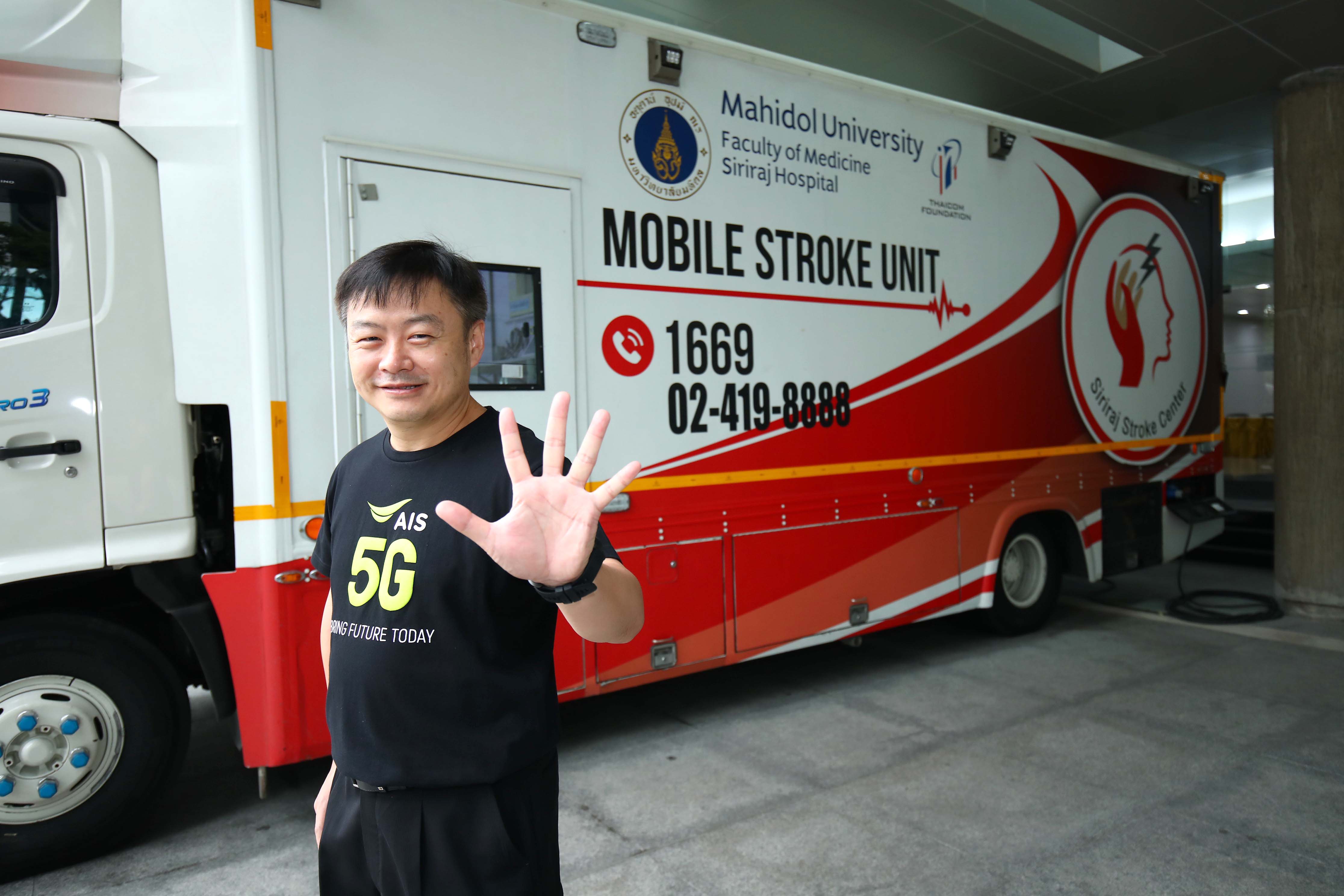 ซึ่งออกแบบและสร้างโดยศูนย์โรคหลอดเลือดสมองศิริราช คณะแพทยศาสตร์ศิริราชพยาบาล และคณะวิศวกรรมศาสตร์ มหาวิทยาลัยมหิดล ด้วยคุณสมบัติอันโดดเด่นของเครือข่าย 5G ทั้งในเรื่องความเร็วสูง (High Speed), ความหน่วงต่ำ (Low Latency) และความสามารถในการเชื่อมต่ออุปกรณ์ที่หลากหลาย (IoT Connectivity) จะเข้ามาเสริมประสิทธิภาพการรักษาในระยะฉุกเฉินให้กับผู้ป่วยโรคหลอดเลือดสมองเฉียบพลันทั้งชนิดตีบและแตกอย่างรวดเร็ว เพิ่มโอกาสในการรักษาอย่างทันท่วงทีและลดการสูญเสีย ยกระดับการแพทย์เคลื่อนที่พร้อมสร้างประโยชน์เพื่อคนไทยให้เข้าถึงการรักษาพยาบาลอย่างทั่วถึงและเท่าเทียม สอดคล้องกับความมุ่งมั่นตั้งใจของเอไอเอสและแนวคิด “5G ที่จับต้องได้ เพื่อทุกชีวิต”