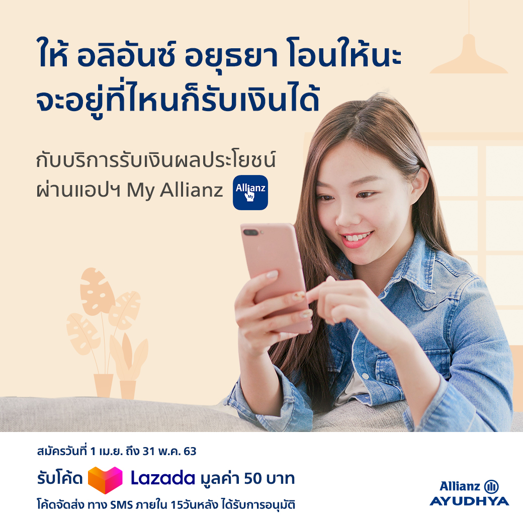 26 พฤษภาคม 2563 : อลิอันซ์ อยุธยา ให้คุณรับเงินผลประโยชน์ได้ง่ายๆ อยู่ที่ไหนก็รอรับเงินได้ กับบริการรับเงินผลประโยชน์ ผ่านแอปพลิเคชัน My Allianz สมัครได้ทันที ไม่ต้องส่งเอกสาร เพียงเข้าแอปฯ กดสมัครขอรับเงินผลประโยชน์ผ่านบัญชีธนาคาร กรอกรายละเอียดให้ครบถ้วน และรอรับเงินได้ภายใน 2 สัปดาห์ สมัครได้ตั้งแต่วันนี้ – 31 พ.ค. 63 พร้อมรับโค้ด Lazada มูลค่า 50 บาท (หมดอายุในวันที่ 30 กันยายน 2563) สำหรับช้อปปิ้งออนไลน์ เพียงดาวน์โหลดแอปฯ My Allianz ซึ่งใช้ได้ทั้งในระบบ IOS และ Android อ่านรายละเอียดเพิ่มเติมได้ที่ https://bit.ly/MayDCA