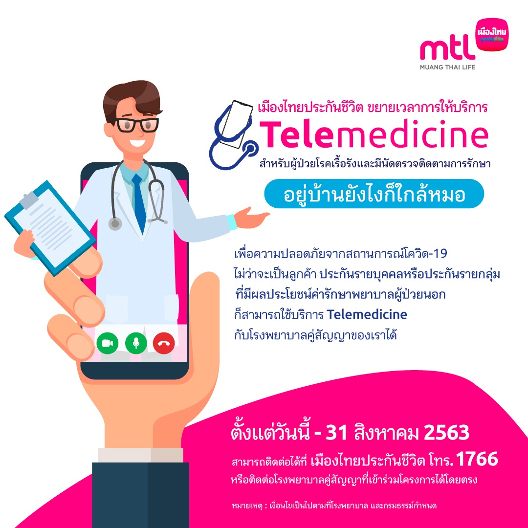 27 พฤษภาคม 2563 : นายสาระ ล่ำซำ กรรมการผู้จัดการและประธานเจ้าหน้าที่บริหาร บริษัท เมืองไทยประกันชีวิต จำกัด (มหาชน) เปิดเผยว่า เพื่อเป็นการควบคุมลดการแพร่ระบาดของโรค และอำนวยความสะดวกเพื่อลดความเสี่ยงในการเดินทางออกจากบ้านของผู้เอาประกันภัย ในช่วงสถานการณ์การแพร่ระบาดของโรคติดเชื้อไวรัสโคโรนา 2019 (COVID-19) นั้น ล่าสุดเมืองไทยประกันชีวิตพร้อมด้วยโรงพยาบาลคู่สัญญาที่เข้าร่วมโครงการ การให้บริการพบแพทย์และได้รับยาตามคำสั่งการรักษาของแพทย์ ผ่านทางโทรเวชกรรม (Telemedicine) สำหรับผู้เอาประกันภัยมีโรคเรื้อรังและมีนัดตรวจติดตามการรักษา ได้ขยายระยะเวลาให้บริการจากเดิมจะให้บริการถึงวันที่ 31 พฤษภาคม 2563 เป็น วันที่ 31 สิงหาคม 2563