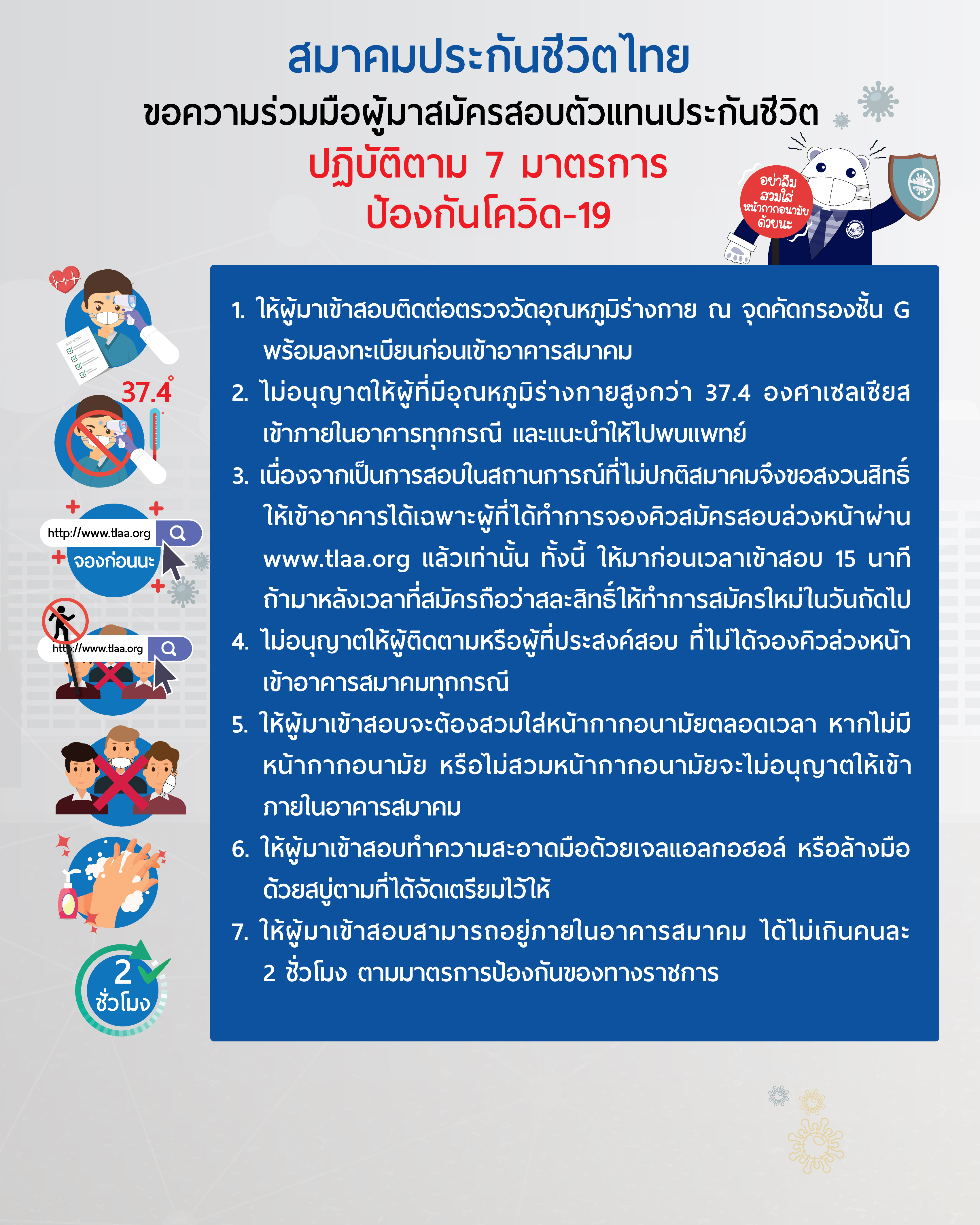 7. ให้ผู้มาเข้าสอบสามารถอยู่ภายในอาคารสมาคม ได้ไม่เกินคนละ 2 ชั่วโมง ตามมาตรการป้องกันของทางราชการ
