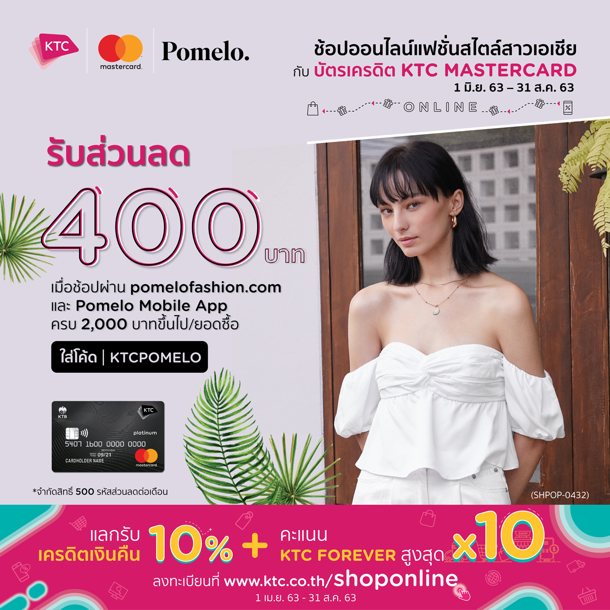 1 มิถุนายน 2563 : “เคทีซี” หรือ บริษัท บัตรกรุงไทย จำกัด (มหาชน) ร่วมกับ โพเมโล (Pomelo) พันธมิตรแฟชันรายล่าสุดที่มียอดขายออนไลน์อันดับหนึ่งในหมวดแฟชัน มอบสิทธิพิเศษให้กับสมาชิกบัตรเครดิตเคทีซี-มาสเตอร์การ์ดทุกประเภท รับส่วนลด 400 บาท เมื่อช้อปสินค้าออนไลน์เท่านั้น ผ่านเว็บไซต์ pomelofashion.com หรือโมบายแอปฯ “Pomelo” ครบ 2,000 บาทขึ้นไปต่อยอดซื้อ พร้อมระบุรหัสส่วนลด “KTCPOMELO” ก่อนการชำระเงินและรับสินค้า ระหว่างวันที่ 1 มิถุนายน 2563 – 31 สิงหาคม 2563