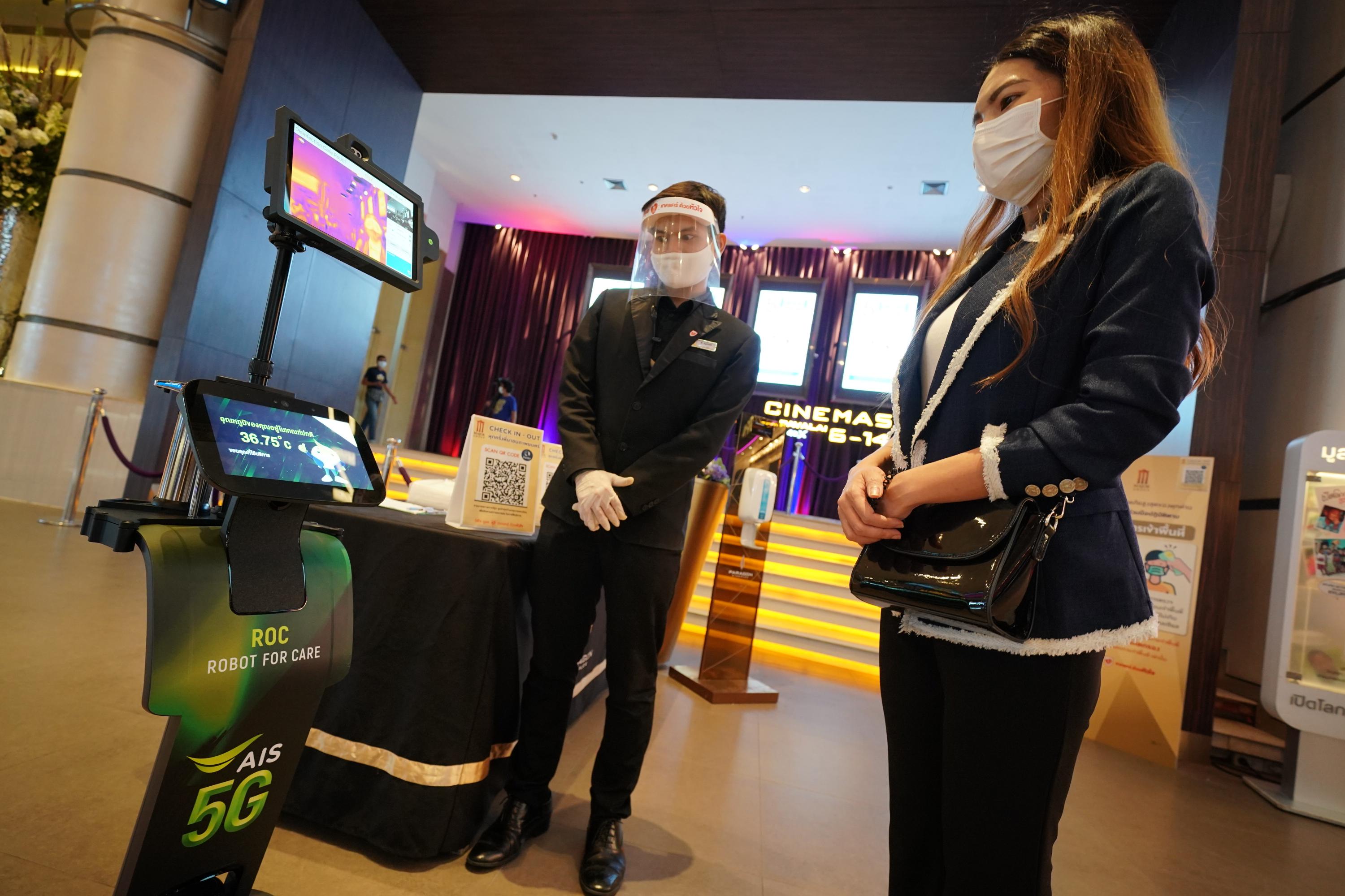 · หุ่นยนต์ ROBOT FOR CARE (ROC) ช่วยปฏิบัติหน้าที่คัดกรองและตรวจวัดอุณหภูมิก่อนเข้าโรงภาพยนตร์, วางเจลแอลกอฮอล์ให้บริการ