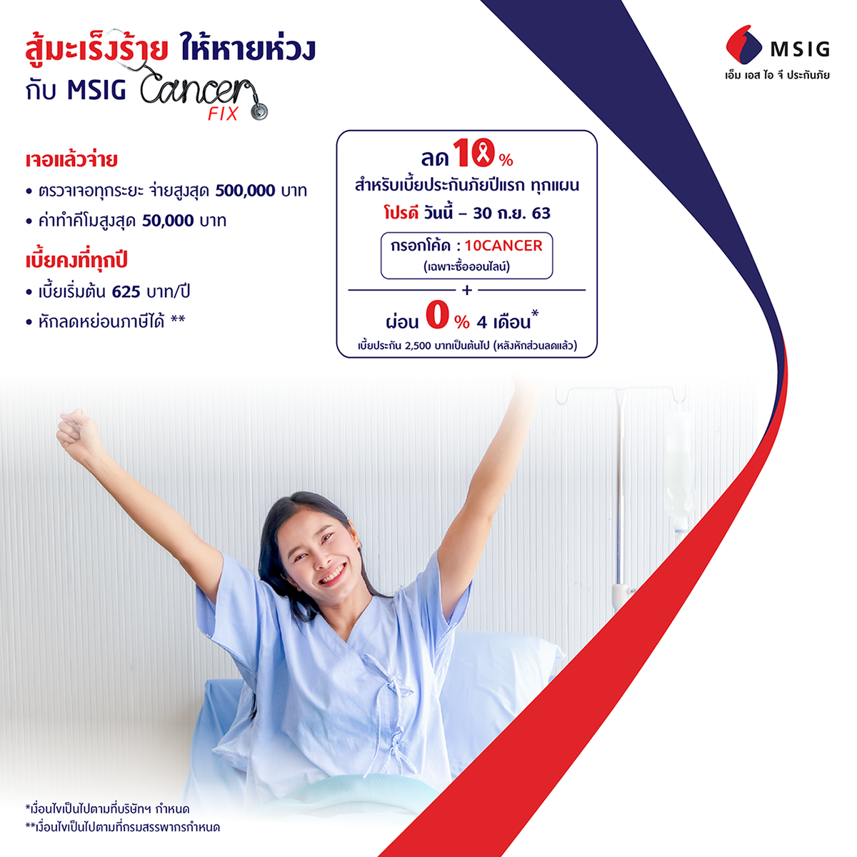 “มะเร็งเป็นโรคร้ายที่คร่าชีวิตคนไทยเป็นอันดับต้นๆ อีกทั้งกระบวนการรักษาต้องใช้เงินมหาศาลในการรักษา เริ่มต้นจากหลักแสนไปจนถึงหลักล้าน เนื่องจากการรักษาที่ต้องทำอย่างต่อเนื่อง ดังนั้น หากทำประกันมะเร็งรายปี ถือเป็นการป้องกันความเสี่ยงทางการเงินที่คุ้มค่า เหมือนเป็นการจ่ายเงินก้อนเล็กเพื่อคุ้มครองเงินก้อนใหญ่ในอนาคต ทางบริษัทฯ มีผลิตภัณฑ์ MSIG Cancer Fix ซึ่งเป็นประกันภัยโรคมะเร็งที่จะทำงานทันที เมื่อตรวจพบเป็นมะเร็งครั้งแรก จ่ายสูงสุด 500,000 บาท พร้อมด้วยผลประโยชน์ชดเชยค่าทำคีโมหรือรังสีรักษาสูงสุดต่อครั้งไม่เกิน 10,000 บาท และสูงสุดต่อปีไม่เกิน 50,000 บาทและการตรวจวินิจฉัยซ้ำสูงสุดไม่เกิน 10,000 บาท”