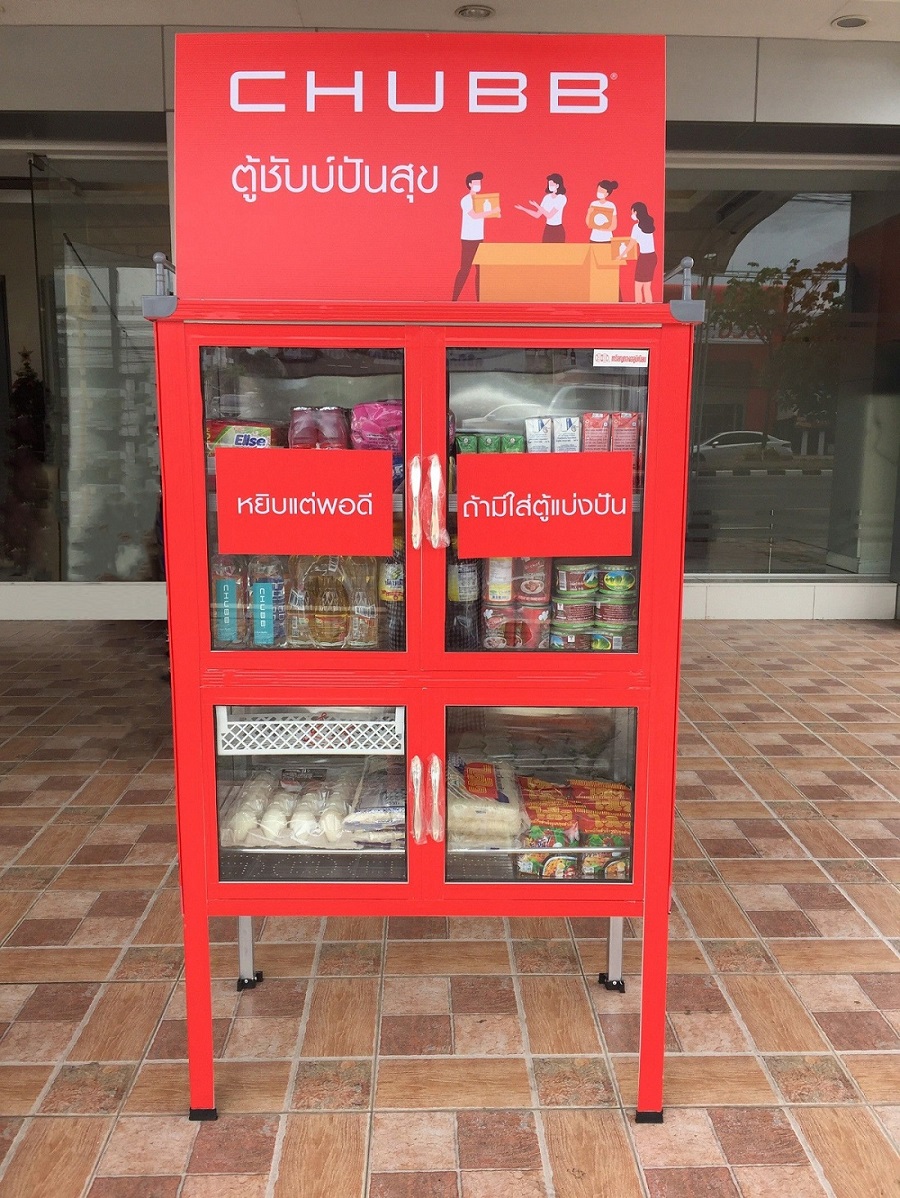 ภายใน “ตู้ชับบ์ปันสุข” บรรจุไปด้วยสิ่งของที่จำเป็นในการยังชีพ อาทิ ข้าวสาร อาหารแห้ง อาหารกระป๋อง น้ำดื่ม ขนมขบเคี้ยว เครื่องดื่มชงสำเร็จรูป นมกล่อง ฯลฯ ซึ่งในวันเปิดตัวตู้ชับบ์ปันสุขนี้ นายแอนดรูว์ นิสเบ็ท พร้อมด้วย พนักงานชับบ์สามัคคีประกันภัย ตัวแทนและนายหน้า และอู่ซ่อมรถยนต์ในเครือข่าย ร่วมกันแจกชุดข้าวกล่องและน้ำดื่มชับบ์ จำนวน 200 ชุด