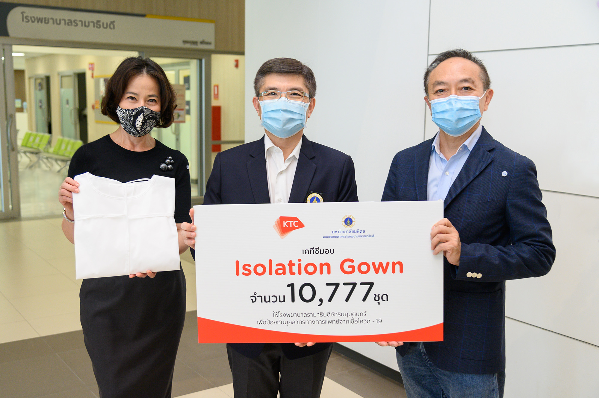 4 มิถุนายน 2563 : ชุติเดช ชยุติ (ขวา) รองประธานเจ้าหน้าที่บริหารอาวุโส – คอร์ปอเรท ไฟแนนซ์ และ พิทยา วรปัญญาสกุล (ซ้าย) รองประธานเจ้าหน้าที่บริหาร – ธุรกิจบัตรเครดิต “เคทีซี” หรือบริษัท บัตรกรุงไทย จำกัด (มหาชน) ร่วมกันมอบ Isolation Gown หรือชุดเสื้อกาวน์ชนิดใช้ครั้งเดียว ทำด้วยผ้าพลาสติคและผ้าสปันบอนด์ (Spunbond) เคลือบกันน้ำ จำนวน 10,777 ชุด รวมมูลค่า 555,302 บาท ให้กับนายแพทย์ไพโรจน์ บุญคงชื่น (กลาง) ผู้อำนวยการโรงพยาบาลรามาธิบดีจักรี นฤบดินทร์ เพื่อส่งต่อให้กับบุคลากรทางการแพทย์ ใช้ป้องกันการติดเชื้อจากผู้ป่วย Covid-19 และลดการปนเปื้อนต่างๆ ขณะปฏิบัติงาน ณ โรงพยาบาลรามาธิบดีจักรีนฤบดินทร์ เมื่อเร็วๆ นี้ ![]()