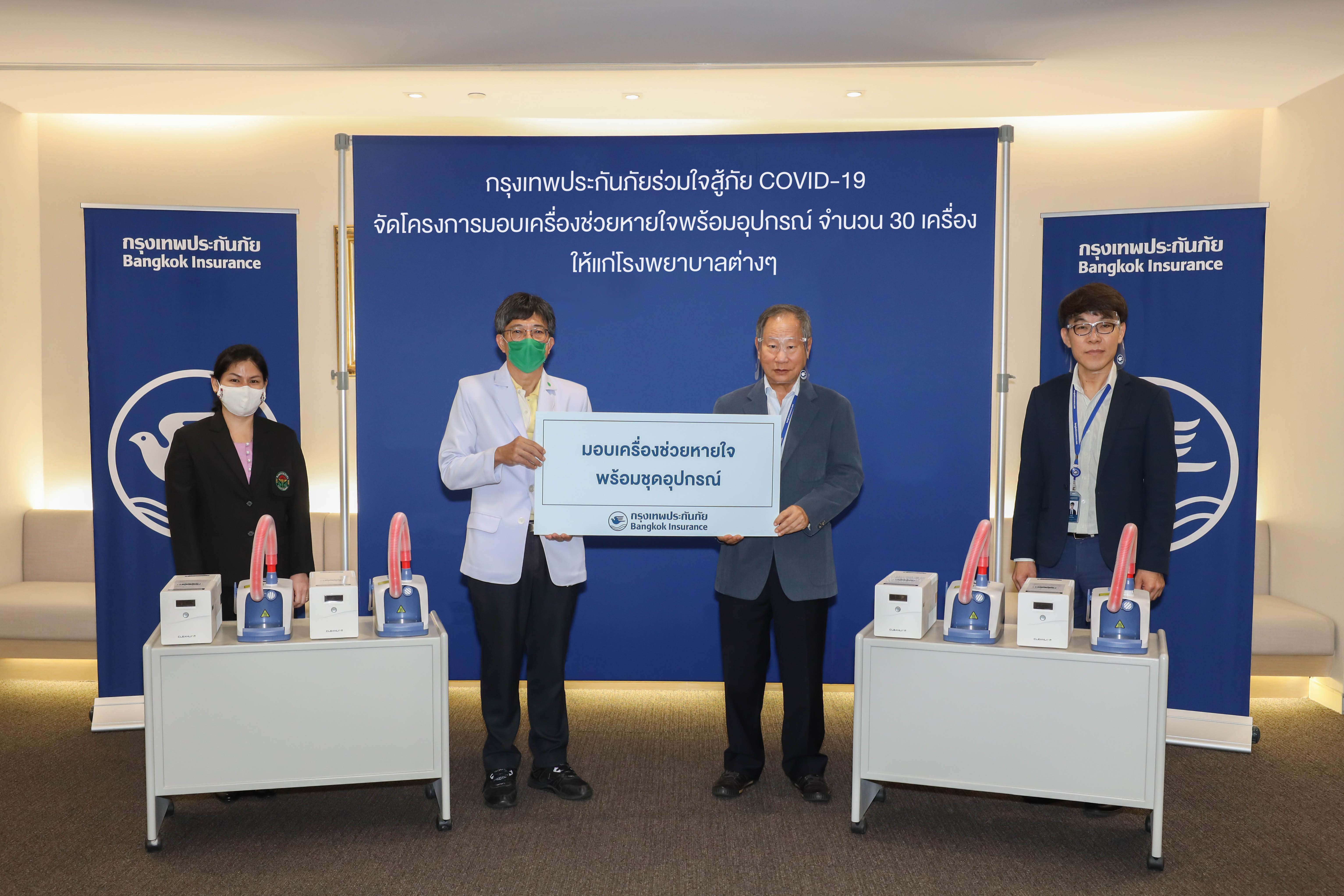 10 มิถุนายน 2563 : บริษัท กรุงเทพประกันภัย จำกัด (มหาชน) หรือ BKI นำโดย ชัย โสภณพนิช (ที่ 2 จากขวา) ประธานกรรมการ พร้อมด้วยดร.อภิสิทธิ์ อนันตนาถรัตน (ขวาสุด) กรรมการและประธานคณะผู้บริหาร มอบเครื่องช่วยหายใจชนิดอัตราการไหลสูงพร้อมชุดอุปกรณ์ จำนวน 4 เครื่อง ให้แก่โรงพยาบาลเลิดสิน กรมการแพทย์ โดยมีนายแพทย์วิพัฒน์ เจริญศิริวัฒน์ (ที่ 2 จากซ้าย) แพทย์เชี่ยวชาญด้านเวชกรรม สาขากุมารเวชกรรม หัวหน้ากลุ่มงานเวชศาสตร์ครอบครัว เป็นผู้แทนรับมอบ เพื่อใช้ในการรักษาผู้ป่วยรองรับสถานการณ์การแพร่ระบาดของโรคติดเชื้อไวรัสโคโรนา (COVID-19) รวมถึงผู้ป่วยวิกฤติที่จำเป็นต้องใช้เครื่องช่วยหายใจ ณ อาคารกรุงเทพประกันภัย ถนนสาทรใต้ เมื่อวันที่ 8 มิถุนายน 2563