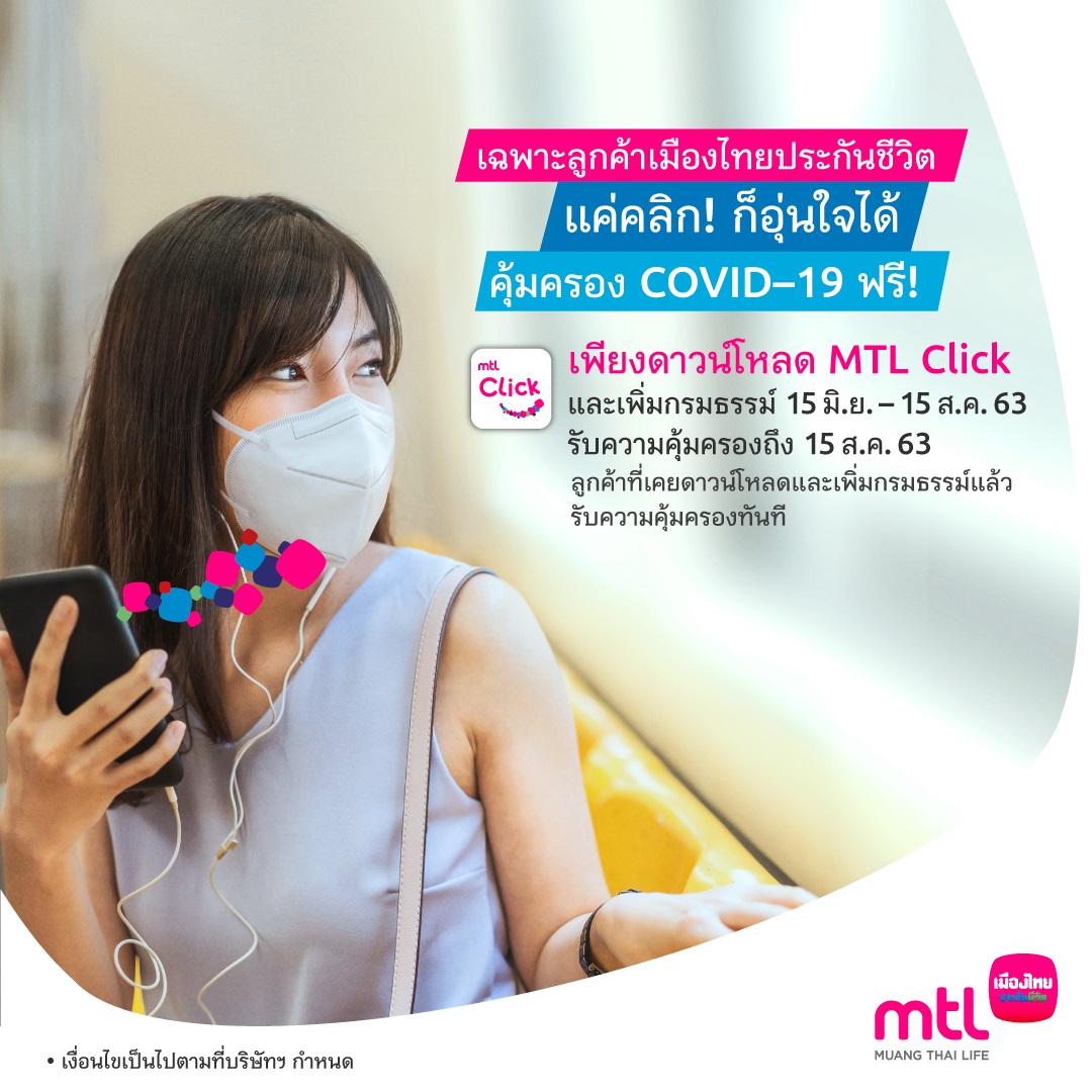 ทั้งนี้เพื่อเป็นการมอบความห่วงใยและความอุ่นใจให้กับลูกค้าของเมืองไทยประกันชีวิตอย่างต่อเนื่อง บริษัทฯ จึงได้มอบความคุ้มครอง COVID-19 ฟรี! ให้แก่ลูกค้าใหม่ที่มีกรมธรรม์ประกันรายบุคคลหรือประกันกลุ่ม ที่กรมธรรม์ยังมีผลความคุ้มครอง และอายุผู้เอาประกันภัยไม่เกิน 70 ปี เพียงดาวน์โหลด แอปพลิเคชัน “MTL Click” พร้อมลงทะเบียนและเพิ่มกรมธรรม์ที่มีอยู่แล้วให้เสร็จสมบูรณ์ จะได้รับสิทธิความคุ้มครอง ตั้งแต่วันที่ 15 มิถุนายน 2563 หรือวันที่ลูกค้าดาวน์โหลดและเพิ่มกรมธรรม์ในแอปพลิเคชัน MTL Click (แล้วแต่เหตุการณ์ใดเกิดขึ้นหลังสุด) และความความคุ้มครองจะสิ้นสุด ณ วันที่ 15 สิงหาคม 2563