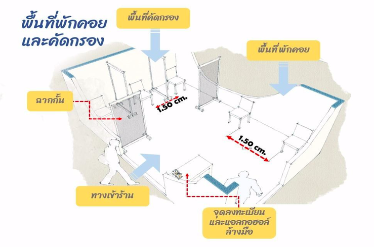 · สำหรับจุดคัดกรอง พื้นที่รอรับบริการ หากไม่มีพื้นที่ด้านนอกอาคาร ให้กันพื้นที่ต้อนรับส่วนหนึ่งไว้เป็นจุดคัดกรอง และมีฉากกั้นก่อนเข้าสู่พื้นที่นั่ง