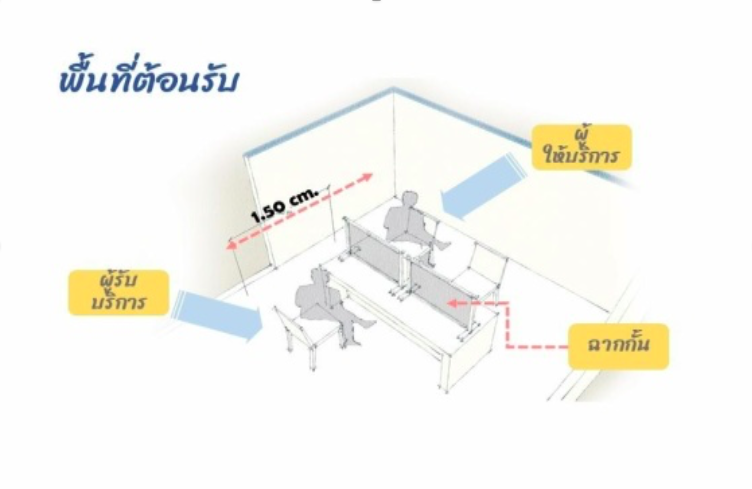 · พื้นที่ให้คำปรึกษา เคาท์เตอร์ประชาสัมพันธ์ แคชเชียร์ ให้วางตำแหน่งของผู้ใช้บริการด้านหน้าเคาท์เตอร์ มีระยะห่าง 1.50 เมตร พร้อมติดตั้งฉากกั้นระหว่างผู้ใช้บริการ และผู้ให้บริการ