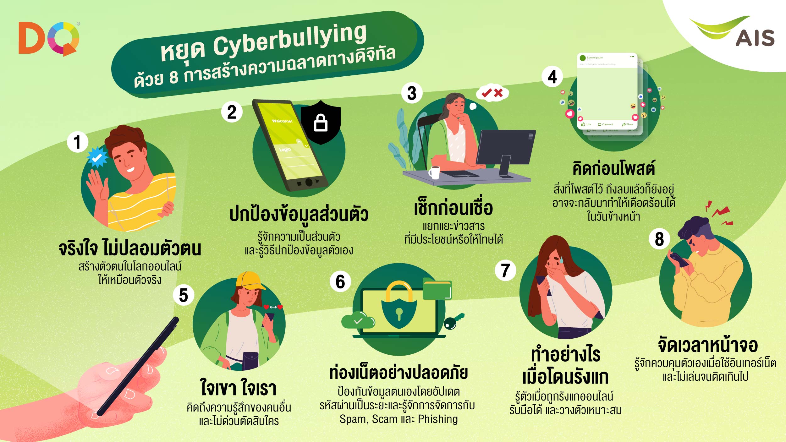 ดังนั้น เอไอเอส ในฐานะ Digital Life Service Provider จึงถือเป็นภารกิจสำคัญที่ต้องการส่งเสริมให้ครอบครัวและเด็กไทย เกิดการใช้สื่อดิจิทัลอย่างปลอดภัยและสร้างสรรค์ ไม่เป็นผู้ที่รังแกคนอื่น และรับมือการถูกรังแกได้อย่างเหมาะสม โดยในปีที่ผ่านมา เราได้ริเริ่มโครงการ “อุ่นใจไซเบอร์” ที่มุ่งสร้างความตระหนักรู้ถึงภัยไซเบอร์ที่อาจเกิดขึ้นกับตนเอง หากใช้งานสื่อดิจิทัลอย่างไม่ระมัดระวัง ด้วยการพัฒนาหลักสูตรแบบเรียนรู้ (Self Learning) เพื่อให้เด็กไทยและคนไทยเข้าไปเรียนรู้และสร้างความฉลาดทางดิจิทัลหรือ DQ (Digital Quotient) โดยมี 8 ทักษะพื้นฐานที่เป็นเกราะป้องกันภัยไซเบอร์ โดยในนี้ มีอย่างน้อย 4 ทักษะ ที่จะเป็นวัคซีนต่อต้านภัย Cyberbullying ได้แก่