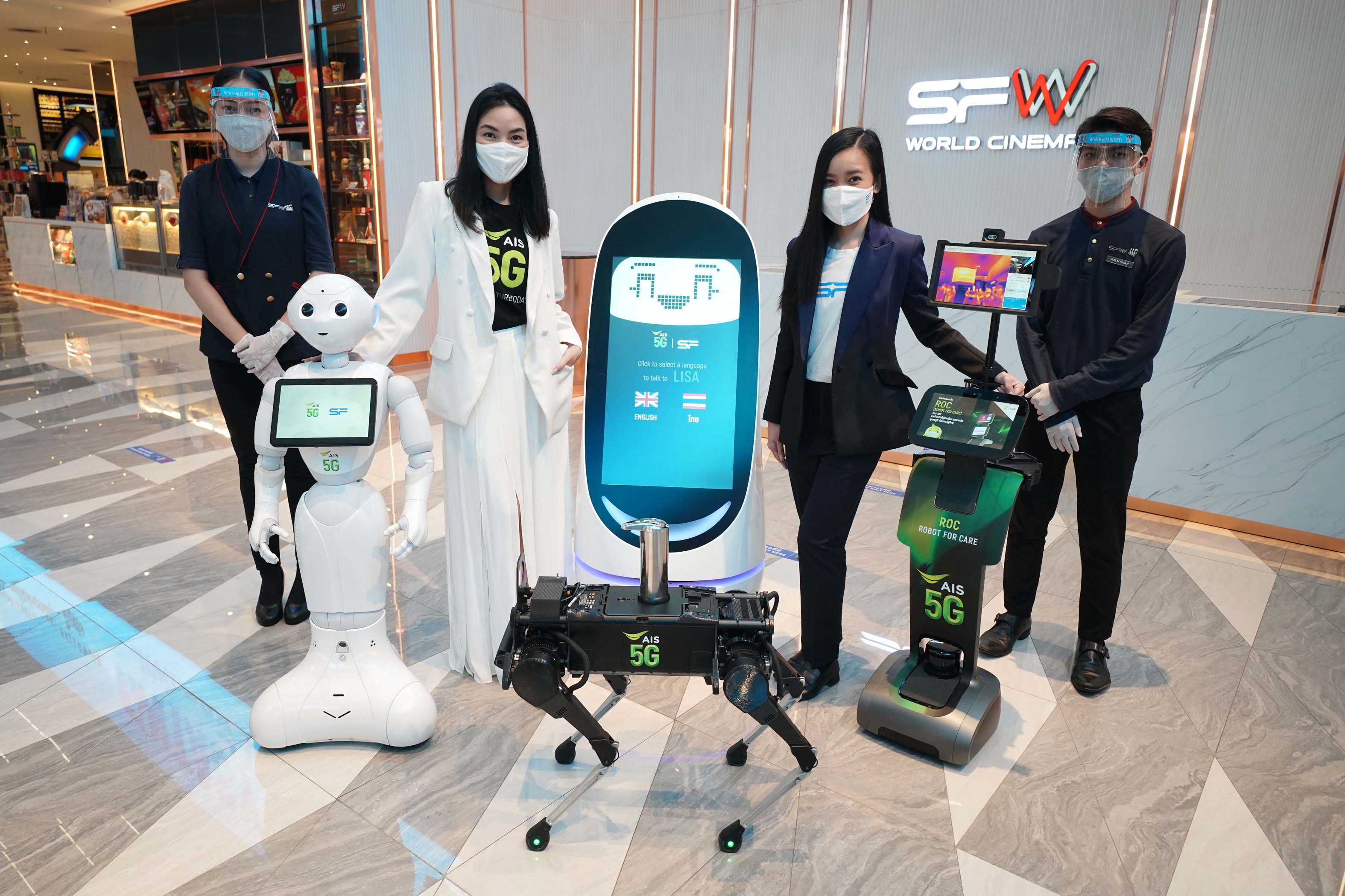 22 มิถุนายน 2563 : เอไอเอส โดยนางศิวลี บูรณสงคราม หัวหน้าแผนกงานบริหารแบรนด์ ผนึก เอส เอฟ โดยนางสาวพิมสิริ ทองร่มโพธิ์ ผู้อำนวยการฝ่ายการตลาด ยกระดับมาตรการดูแลลูกค้าของโรงภาพยนตร์ในเครือ เอส เอฟ ด้วยการนำเครือข่าย 5G พร้อมหุ่นยนต์อัจฉริยะ 4 แบบ ได้แก่ หุ่นยนต์ ROBOT FOR CARE (ROC), AIS K9, LISA และ PP ทำหน้าที่คอยต้อนรับ ให้ข้อมูลลูกค้า และนำทางจากจุดหนึ่งไปยังอีกจุดที่กำหนดไว้, ช่วยคัดกรอง ตรวจวัดอุณหภูมิลูกค้า ให้บริการเจลแอลกอฮอลล์ ก่อนเข้าโรงภาพยนตร์ เพื่อลดการสัมผัส และป้องกันการแพร่ระบาดของ COVID-19 ภายในพื้นที่โรงภาพยนตร์ เอส เอฟ เวิลด์ ซีเนม่า ศูนย์การค้าเซ็นทรัลเวิลด์