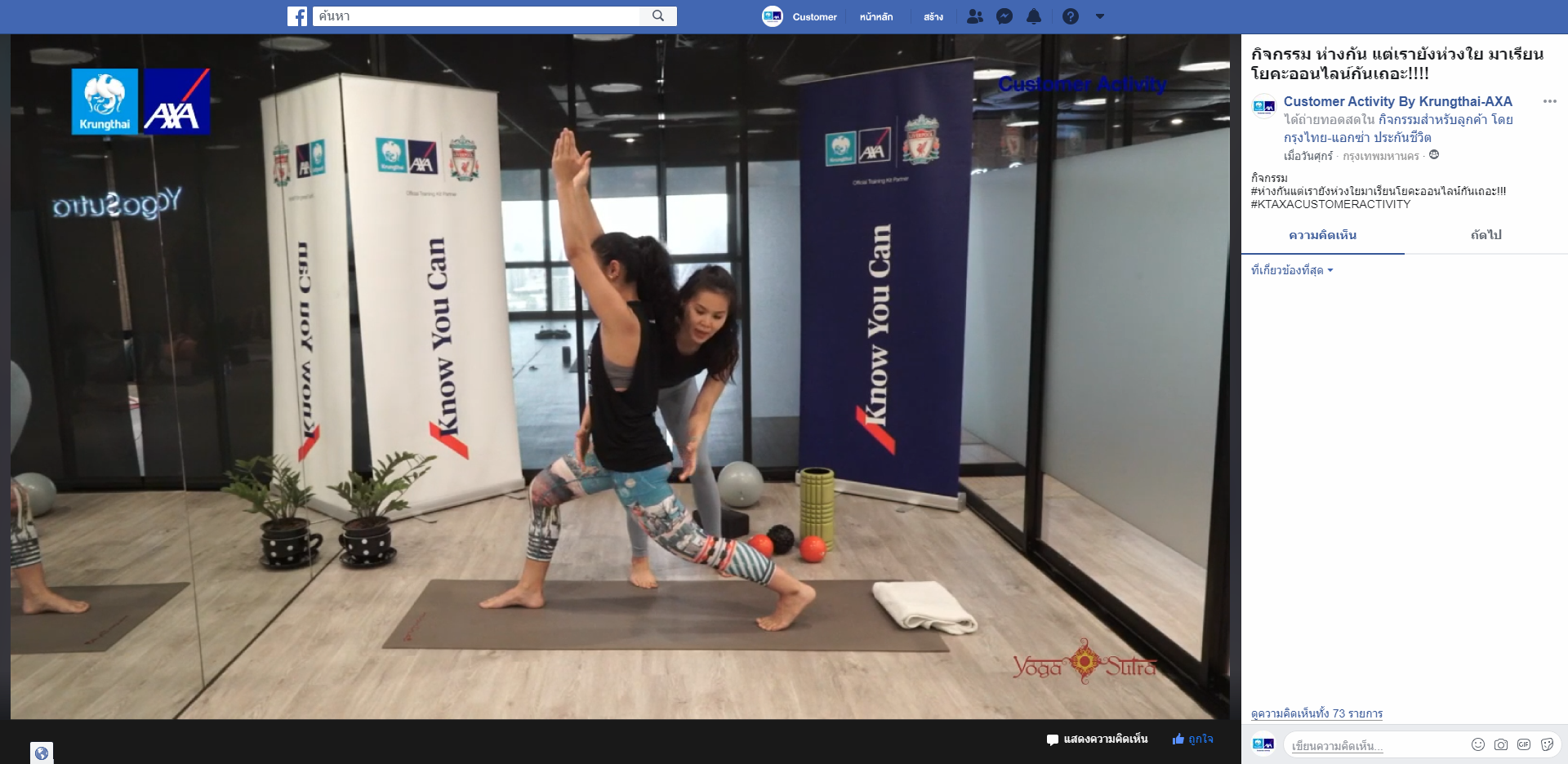 23 มิถุนายน 2563 : strong>บมจ.กรุงไทย-แอกซ่า ประกันชีวิต จัดกิจกรรมสุดพิเศษ “ห่างกันแต่เรายังห่วงใย มาเรียนโยคะออนไลน์กันเถอะ” เพื่อให้ลูกค้าได้มีสุขภาพที่ดีได้ง่ายๆ จากที่บ้าน แบบนิว นอร์มอล (New Normal) กับครูผู้มากประสบการณ์จาก โยคะสุตรา สตูดิโอ โดยหลักสูตรที่ลูกค้าได้เรียนในครั้งนี้ คือ หฐโยคะ ซึ่งเป็นโยคะที่มีท่าอาสนะ และมีประโยชน์ในการช่วยให้ ร่างกายยืดหยุ่น ควบคุมการหายใจ ช่วยเพิ่มความสมดุลให้ร่างกายและจิตใจ เหมาะอย่างยิ่งสำหรับผู้สนใจใหม่ๆ ที่อยากเริ่มต้นฝึกโยคะ