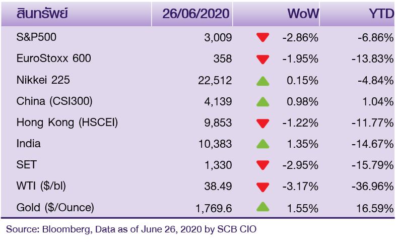 30 มิถุนายน 2563 : SCB Chief Investment Office (SCB CIO) วิเคราะห์ ในสัปดาห์ที่ผ่านมา (22 – 26 มิ.ย.) ตลาดหุ้นโลกปิดผสมผสาน โดยตลาดหุ้นสหรัฐฯ ปรับลดลง เนื่องจาก ความกังวลการแพร่ระบาดของโควิด-19 ระลอกที่สอง หลังจำนวนผู้ติดเชื้อใหม่ในสหรัฐฯ ปรับเพิ่มขึ้นในหลายมลรัฐฯ และความกังวลเศรษฐกิจหดตัว หลังกองทุนการเงินระหว่างประเทศ (IMF) ปรับลดคาดการณ์เศรษฐกิจโลก และเศรษฐกิจสหรัฐฯ ในปีนี้ จะหดตัว -4.9% และ -8% ตามลำดับ
