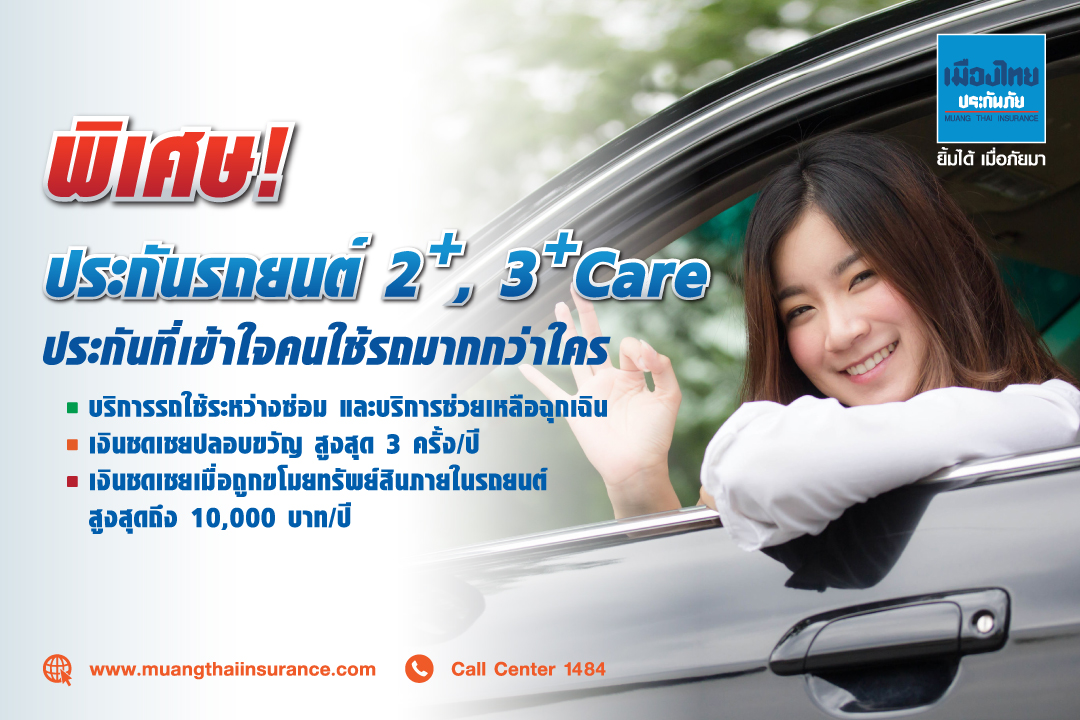 ประกันรถยนต์ 2+ 3+ CARE ประกันภัยที่เข้าใจคนใช้รถมากกว่าใคร มาพร้อมบริการอัดแน่น ตั้งแต่รถใช้ระหว่างรอซ่อม บริการช่วยเหลือรถเสียฉุกเฉิน เงินชดเชยปลอบขวัญกรณีรถชน (สูงสุด 3 ครั้ง/ปี) ความคุ้มครองเมื่อถูกขโมยทรัพย์สินภายในรถยนต์ (สูงสุด 10,000 บาท/ปี) และแถมยังคุ้มครองอายุรถถึง 20 ปี