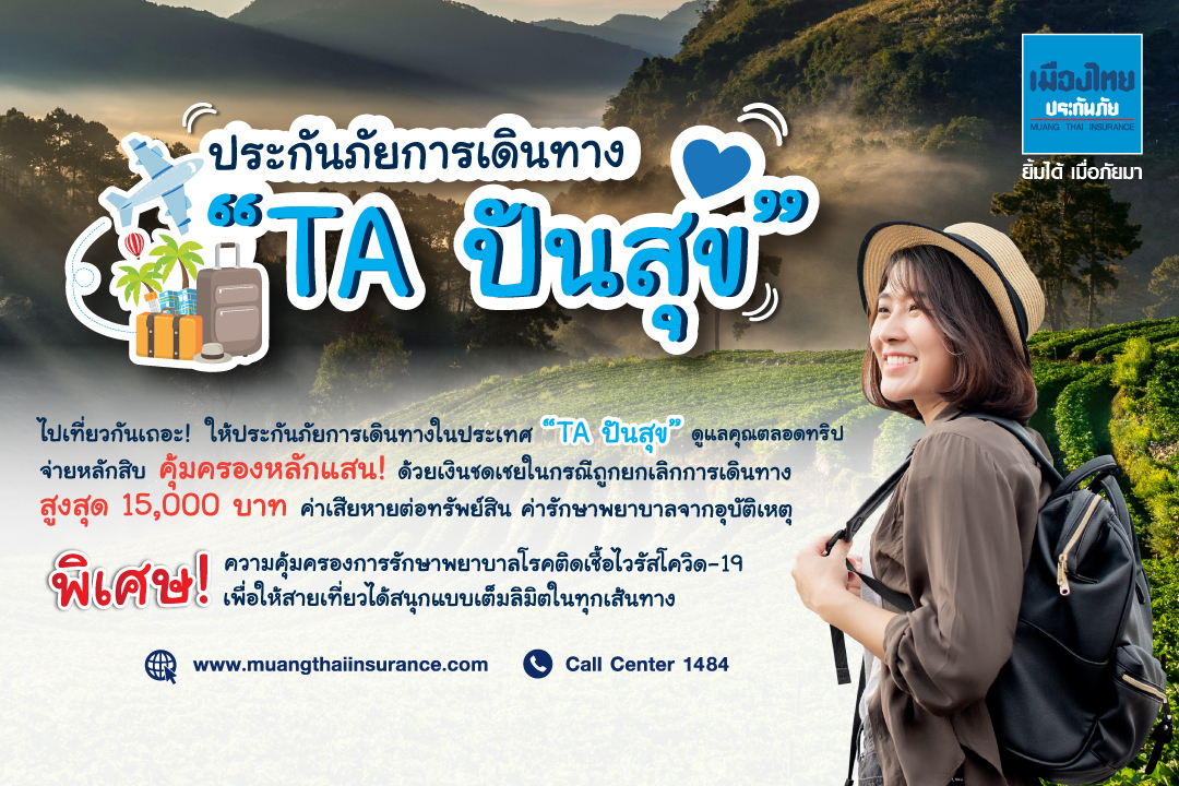 ประกันเดินทาง TA ปันสุข (ภายในประเทศ) มีให้เลือก 2 แบบ คือ แผนการเดินทางรายเดี่ยว และแผนการเดินทางแบบกลุ่ม มาพร้อมเบี้ยสุดคุ้ม จ่ายหลักสิบ รับความคุ้มครองหลักแสน! รับเงินชดเชยเมื่อถูกยกเลิกการเดินทางสูงสุด 15,000 บาท ค่ารักษาพยาบาลจากอุบัติเหตุ พิเศษ! ค่ารักษาพยาบาลจากโรคติดเชื้อไวรัสโควิด-19 (ตั้งแต่วันนี้จนถึงสิ้นปี 2563) เพื่อให้คุณเที่ยวสนุกแบบไม่มีอะไรขวางกั้น