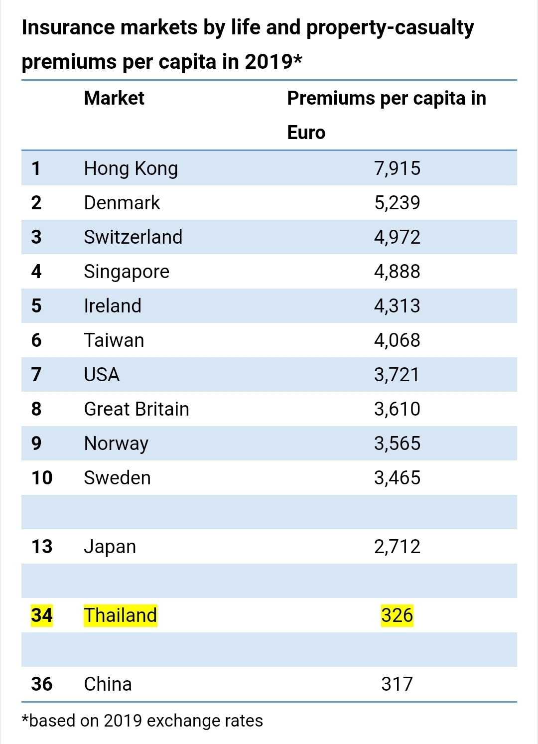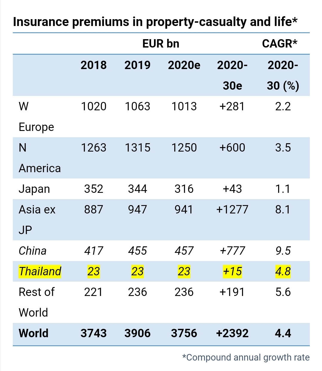 อย่างไรก็ตาม หลังจากวิกฤต ตลาดประกันในประเทศไทยจะฟื้นตัวได้อย่างรวดเร็วในปี 2564 ด้วยอัตราการเติบโตประมาณ 8% ในช่วง 10 ปีนี้หรือจนถึงปี 2573 มีการคาดการณ์ว่าประเทศไทยจะมีอัตราการเติบโตที่เพิ่มขึ้นเป็น 4.8% ต่อปี ซึ่งแสดงให้เห็นว่าตลาดประกันในประเทศไทยเป็นหนึ่งในตลาดที่โตมากที่สุดตลาดหนึ่งในภูมิภาค โดยเบี้ยประกันต่อหัวอยู่ที่ 326 ยูโร (หรือประมาณ 11,410 บาท) ในปี 2562 (ตัวเลขเฉลี่ยของภูมิภาค 255 ยูโร หรือประมาณ 8,925 บาท) และมีอัตราการเข้าถึงประกัน (สัดส่วนของเบี้ยประกันต่อจีดีพี) อยู่ที่ 4.5%