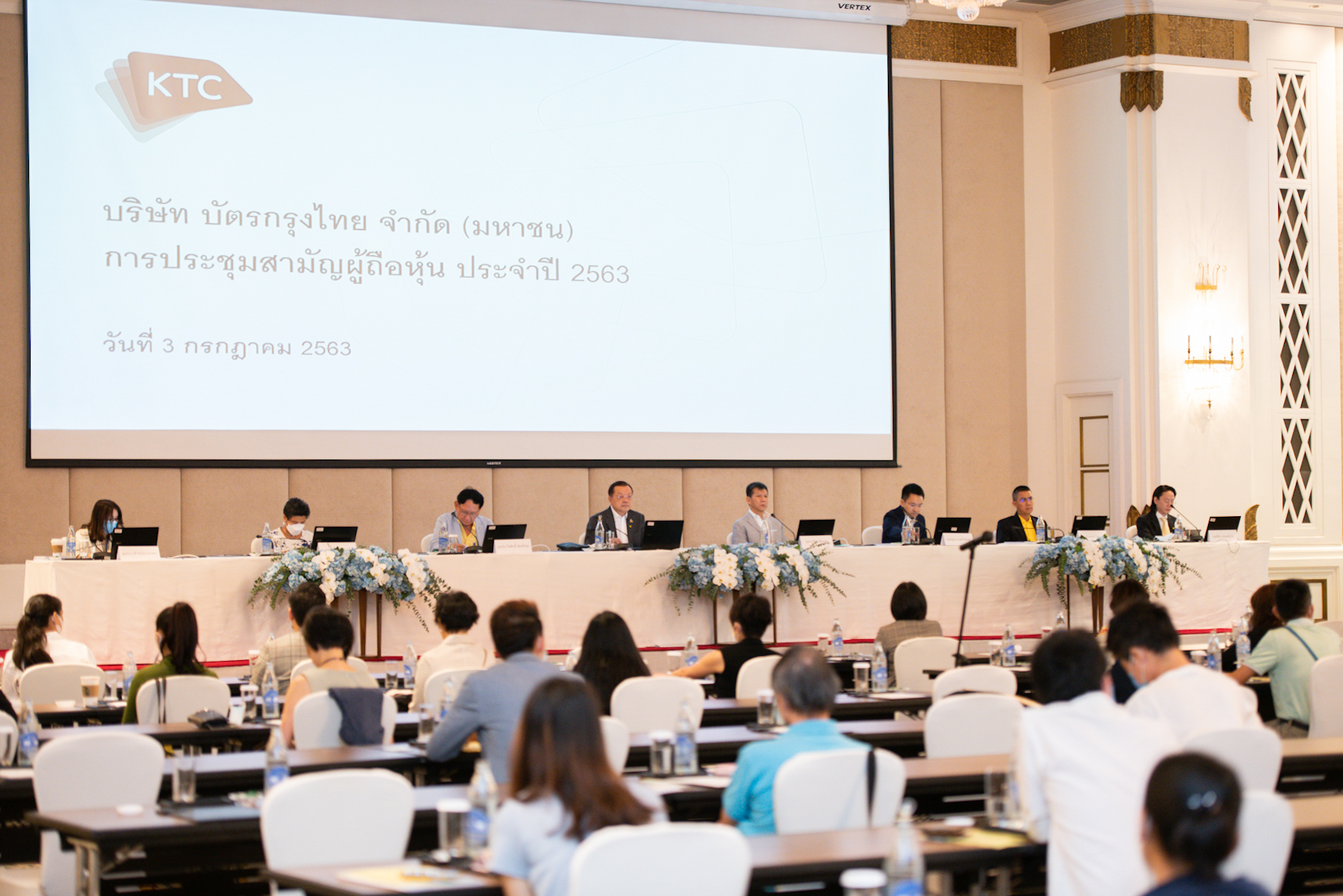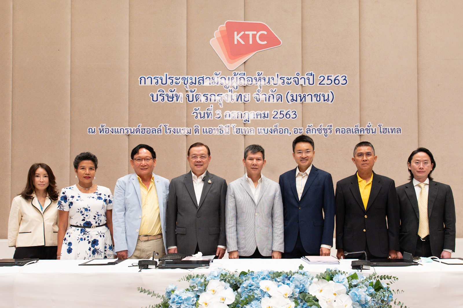 3 กรกฎาคม 2563 : นายปริญญา พัฒนภักดี (กลางซ้าย) ประธานกรรมการ ประธานกรรมการสรรหาและกำหนดค่าตอบแทน และนายระเฑียร ศรีมงคล (กลางขวา) กรรมการและประธานเจ้าหน้าที่บริหาร “เคทีซี” หรือ บริษัท บัตรกรุงไทย จำกัด (มหาชน) พร้อมด้วยคณะกรรมการบริษัทฯ ได้จัดประชุมสามัญผู้ถือหุ้นประจำปี 2563 (ครั้งที่ 18) เพื่อรายงานผลการดำเนินงานประจำปี และนำเสนอวาระเพื่อพิจารณาต่างๆ