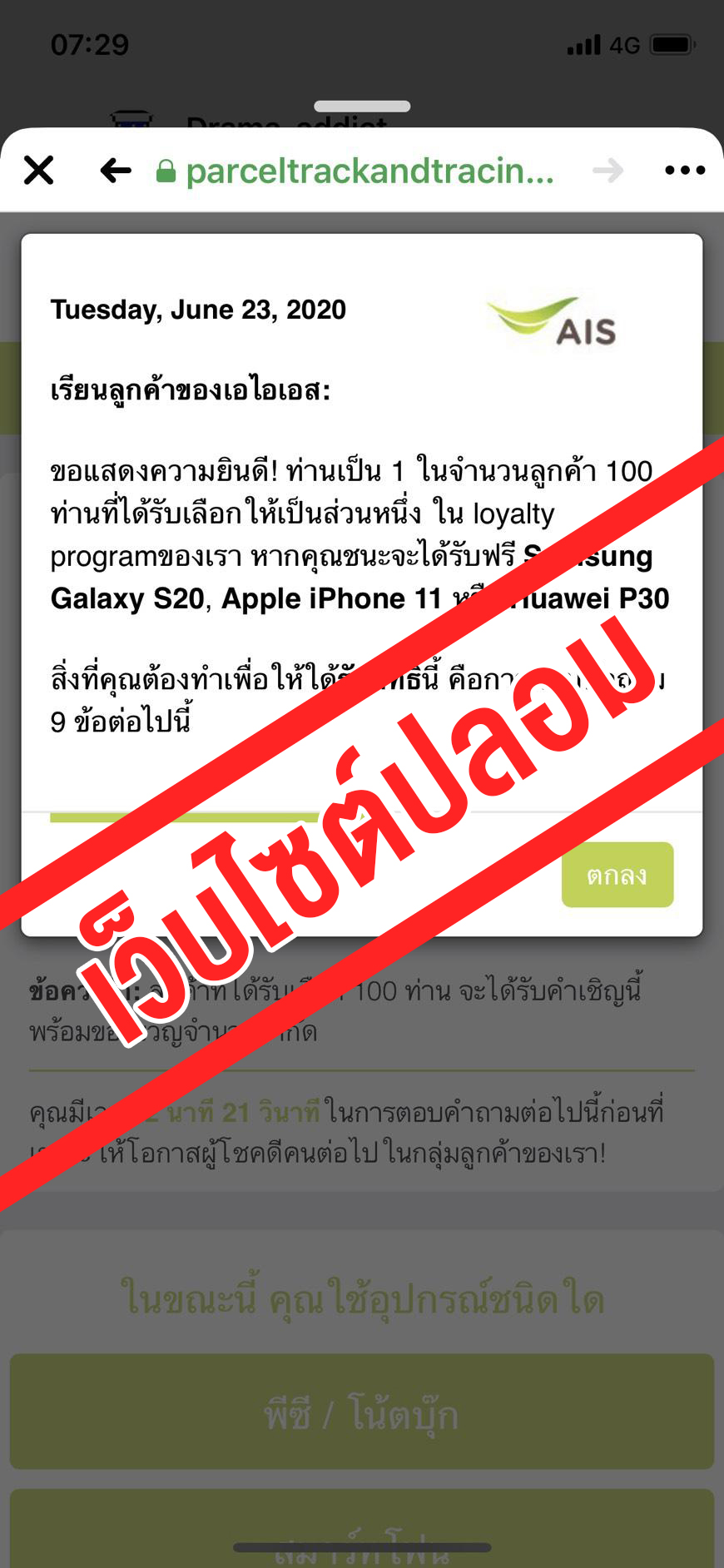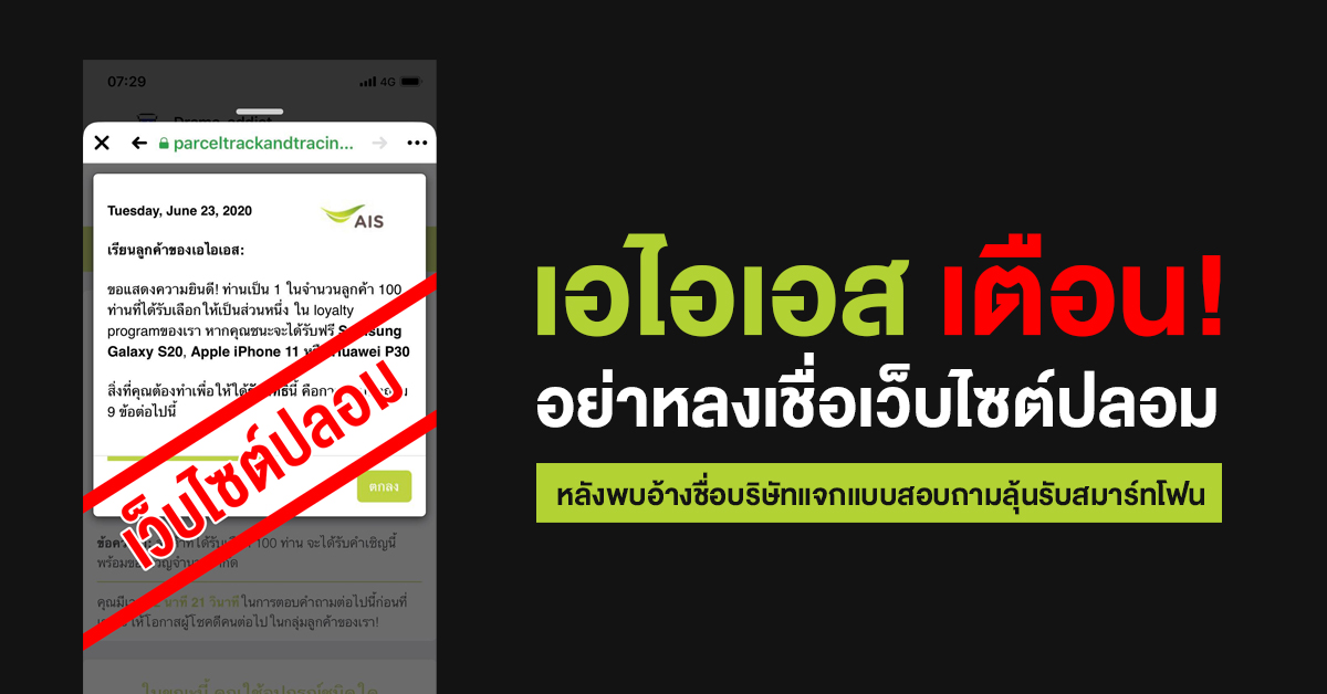 นางสายชล ทรัพย์มากอุดม หัวหน้าฝ่ายงานประชาสัมพันธ์ เอไอเอส กล่าวว่า “ตามที่ได้ปรากฏเว็บไซต์แอบอ้างชื่อบริษัท หลอกขอข้อมูลลูกค้า โดยให้ตอบแบบสอบถามเพื่อลุ้นรับของรางวัลเป็นสมาร์ทโฟนนั้น ทางบริษัทใคร่ขอเรียนชี้แจ้งว่า เอไอเอส ไม่ได้เป็นผู้จัดกิจกรรมดังกล่าวตามที่มีการแอบอ้างแต่อย่างใด จึงขอเตือนประชาชนอย่าหลงเชื่อและให้ข้อมูลกับเว็บไซต์ที่ไม่น่าเชื่อถือ รวมถึงไม่คลิกลิงก์ ดาวน์โหลดไฟล์แนบ หรือส่งต่อในช่วงสถานการณ์การแพร่ระบาดของโควิด-19 ที่ผ่านมา