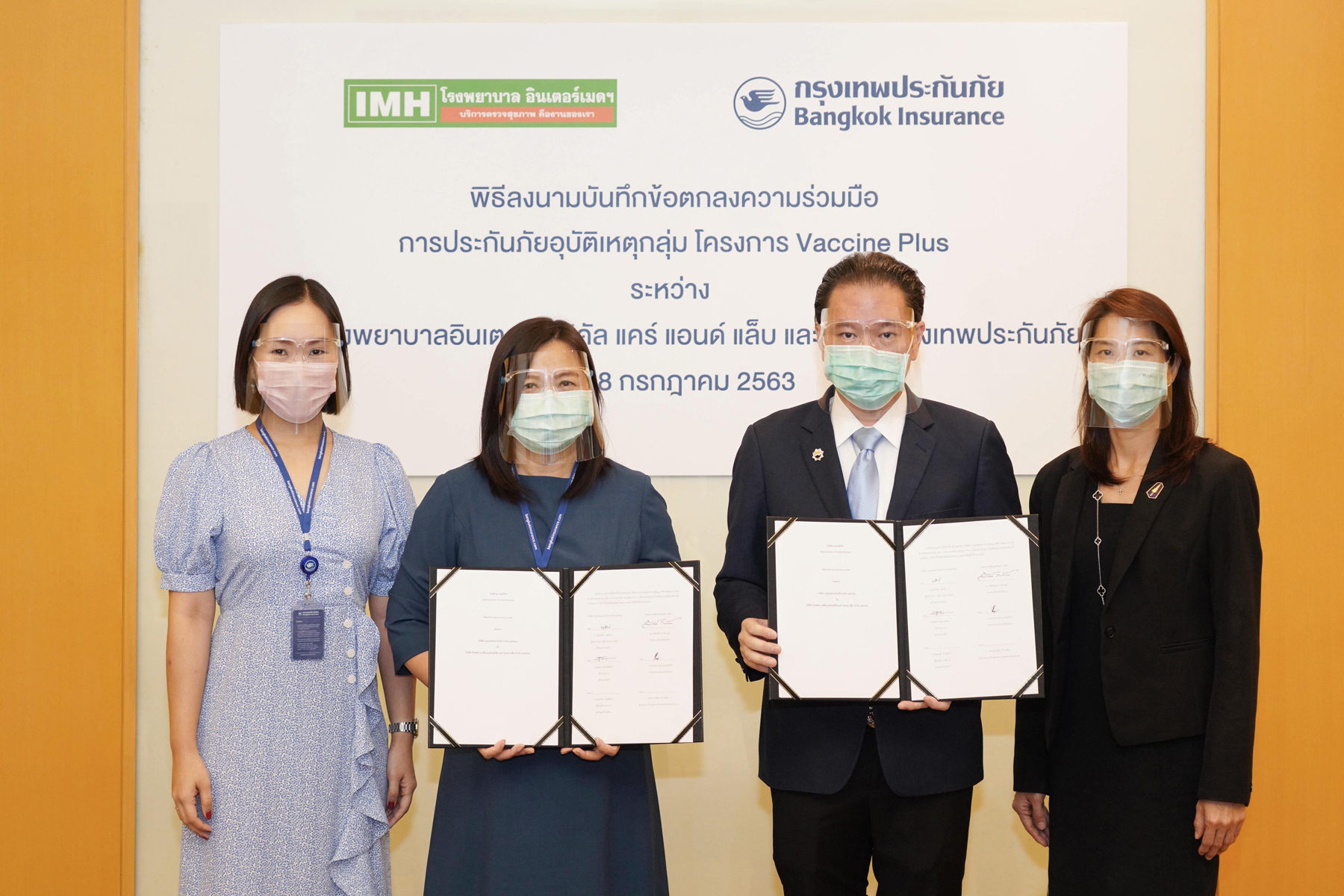 10 กรกฎาคม 2563 : บริษัท กรุงเทพประกันภัย จำกัด (มหาชน) หรือ BKI โดย ปวีณา จูชวน (ที่ 2 จากซ้าย) ผู้ช่วยกรรมการผู้อำนวยการใหญ่ และลสา โสภณพนิช (ซ้ายสุด) ผู้อำนวยการ ธุรกิจนายหน้า และบริษัท โรงพยาบาลอินเตอร์เมดิคัล แคร์ แอนด์ แล็บ จำกัด (มหาชน) หรือ IMH โดย ดร.สิทธิวัตน์ กำกัดวงษ์ (ที่ 2 จากขวา) ประธานเจ้าหน้าที่บริหาร และ ปรมาภรณ์ ปวโรจน์กิจ (ขวาสุด) รองประธานเจ้าหน้าที่บริหาร ร่วมลงนามบันทึกข้อตกลงความร่วมมือในโครงการ Vaccine Plus ซึ่งจะมอบ ประกันอุบัติเหตุและสิทธิประโยชน์ให้แก่ลูกค้าในโครงการดังกล่าว ณ อาคารกรุงเทพประกันภัย สำนักงานใหญ่ ถนนสาทรใต้ เมื่อวันที่ 8 กรกฎาคม 2563 ![]()