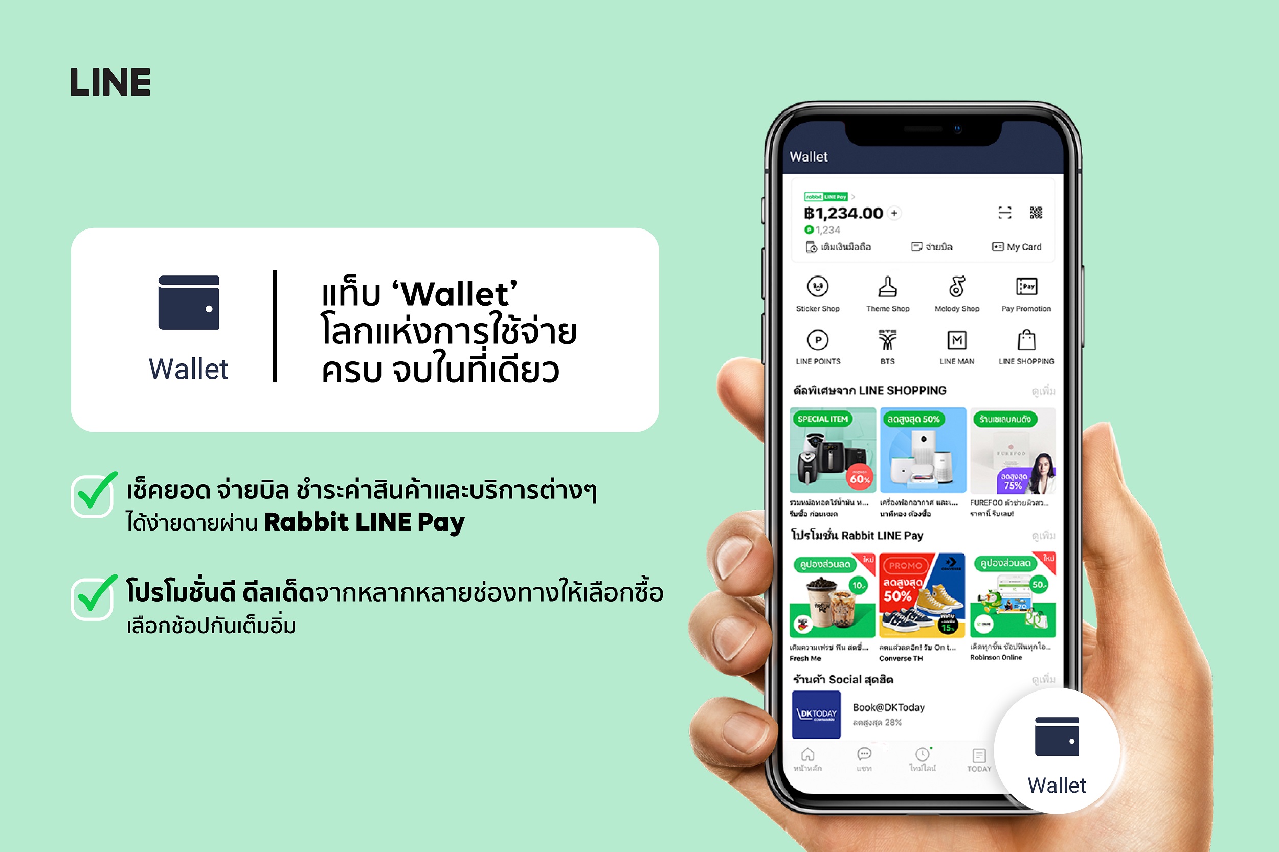 หน้าวอลเล็ท LINE ได้ปรับให้เป็นโลกแห่งการใช้จ่าย ครบ จบในที่เดียว ไม่ว่าจะเป็นการเช็คยอดเงิน จ่ายบิล ชําระค่าสินค้าและบริการต่างๆ ได้ง่ายดายผ่าน Rabbit LINE Pay และโปรโมชั่นดี ดีลเด็ดจากหลากหลายช่องทาง ให้เลือกซื้อ เลือกช้อปกันเต็มอิ่ม ประกอบด้วย