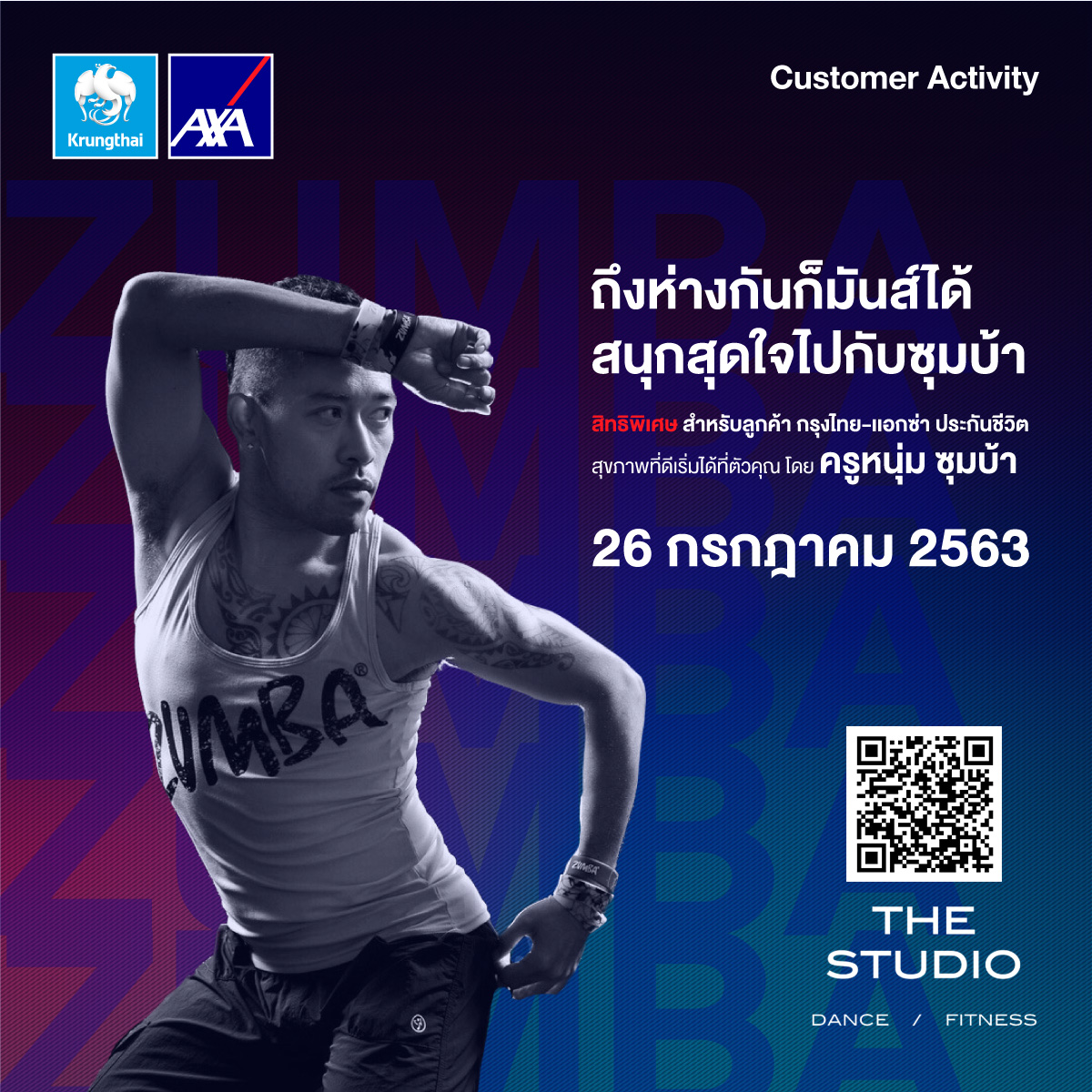 15 กรกฎาคม 2563 : บมจ.กรุงไทย-แอกซ่า ประกันชีวิต ขอเชิญชวนลูกค้าเข้าร่วมกิจกรรม “ถึงห่างกันก็มันส์ได้ สนุกสุดใจไปกับซุมบ้า” มาแดนซ์กันให้กระจาย ฟิตแอนด์เฟิร์มทั้งกาย และจิตใจ เพื่อสุขภาพที่ดีร่วมกันที่บ้าน แบบนิว นอร์มอล (New Normal) กับครูหนุ่ม ซุมบ้า จาก The Studio